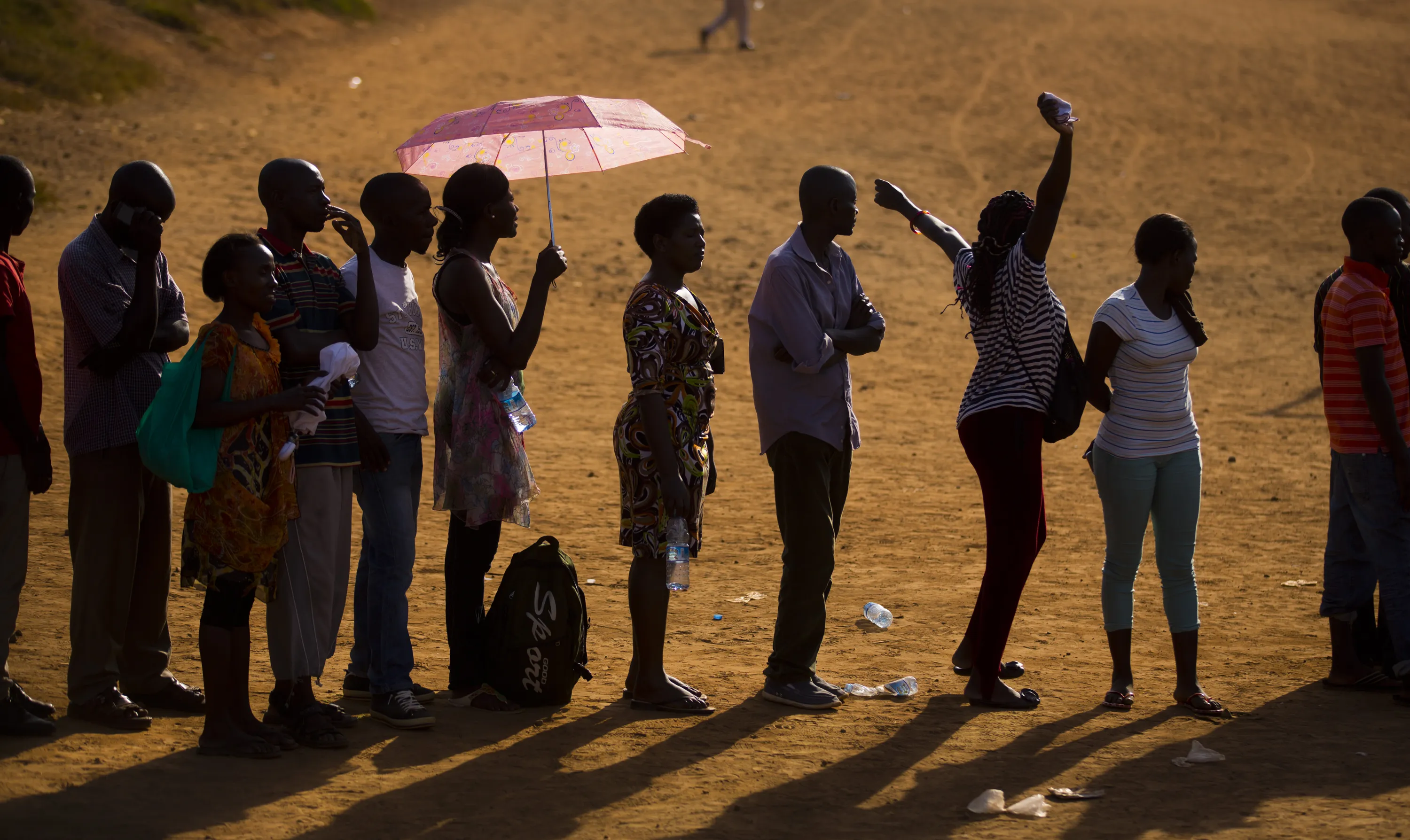 A voter stretches her arms as she and other Ugandans continue to queue to cast their votes at sunset in the capital Kampala, Uganda Thursday, February 18, 2016. Amid tardy delivery of voting materials, Ugandans tried to cast ballots Thursday in presidential and parliamentary elections, while a top international election observer called the delays “worrying” and the main opposition party said they were deliberate. (Photo by Ben Curtis/AP Photo)