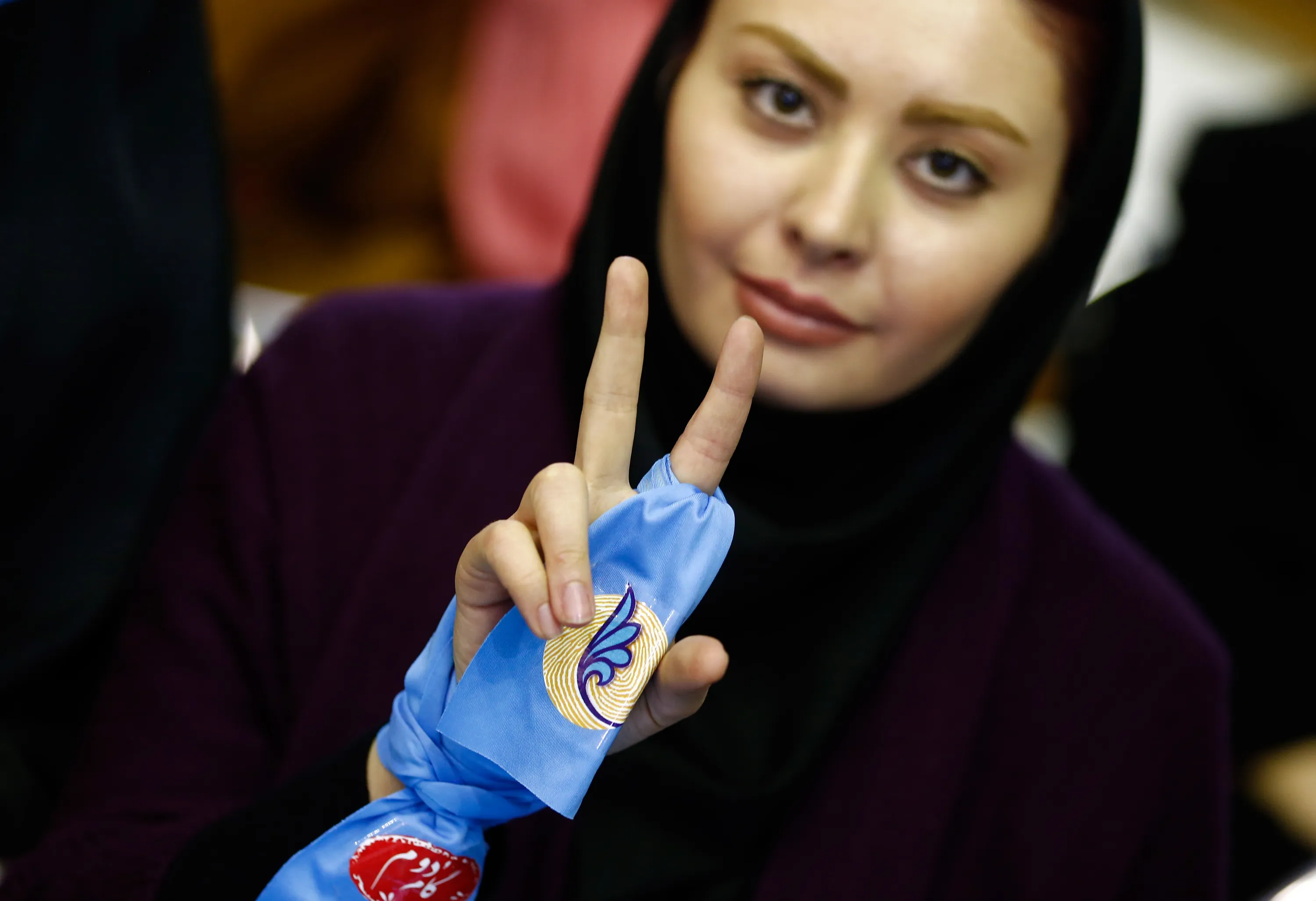 An Iranian supporter of reformist group flashes victory sign during the first reformists election campaign in Tehran, Iran, February 18, 2016. (Photo by Abedin Taherkenareh/EPA)