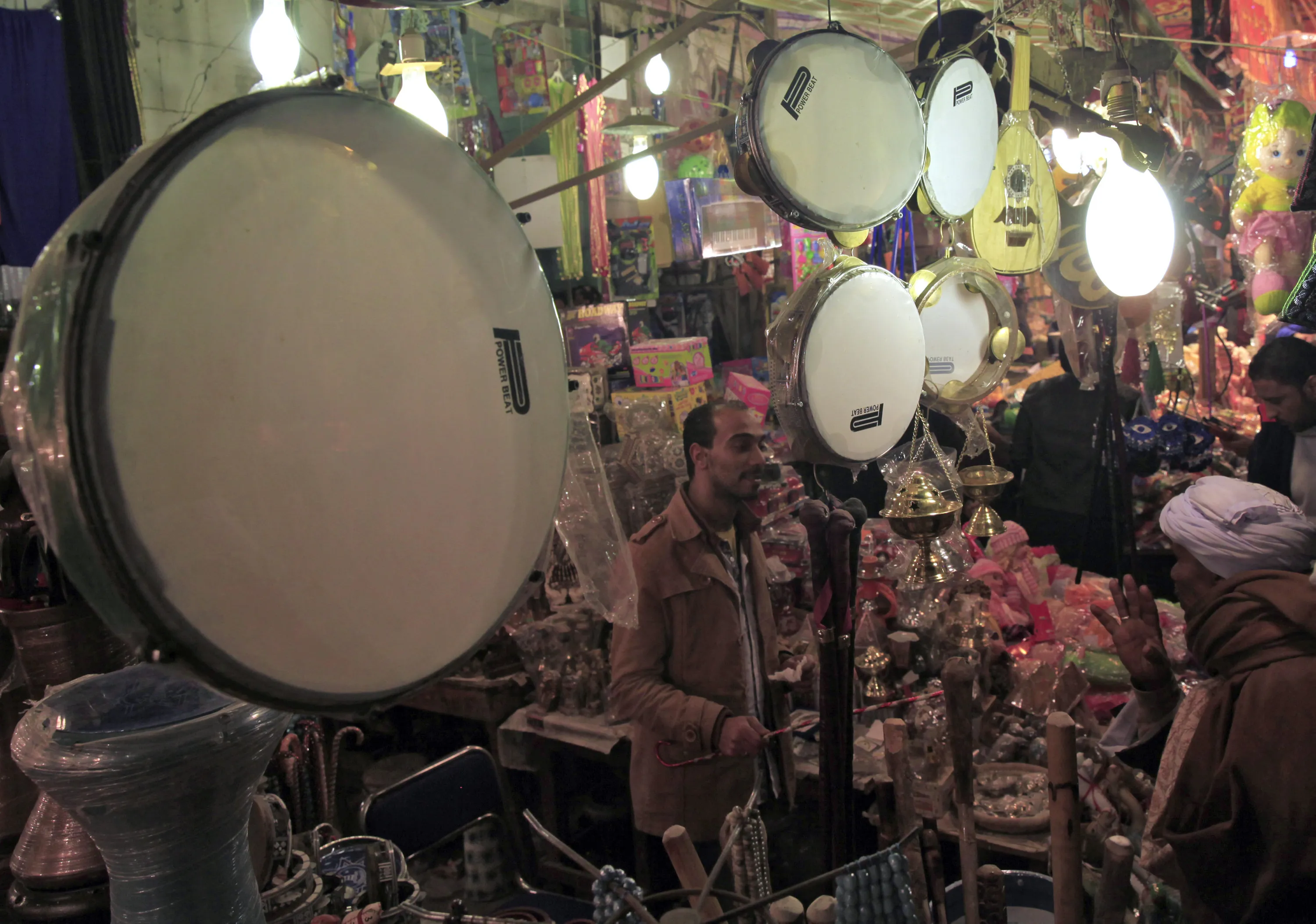 A street vendor sells traditional drums outside Al-Hussein mosque as Muslims celebrate Moulid Al-Hussein, the birthday of Prophet Mohammad's grandson Hussein in old Cairo, Egypt, February 10, 2016. (Photo by Amr Abdallah Dalsh/Reuters)