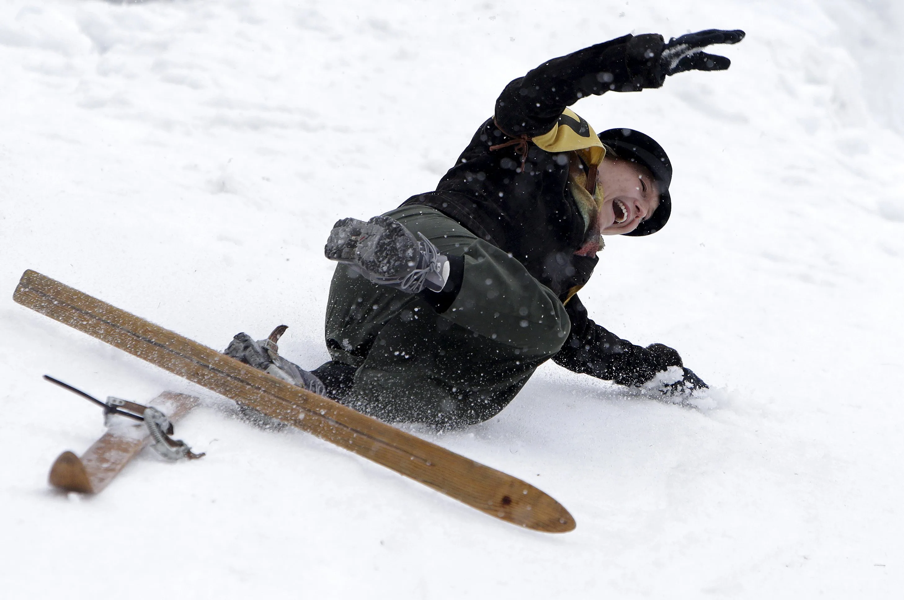 A participant falls on vintage skis during a traditional historical ski race in the northern Bohemian town of Smrzovka, Czech Republic, February 20, 2016. (Photo by David W. Cerny/Reuters)