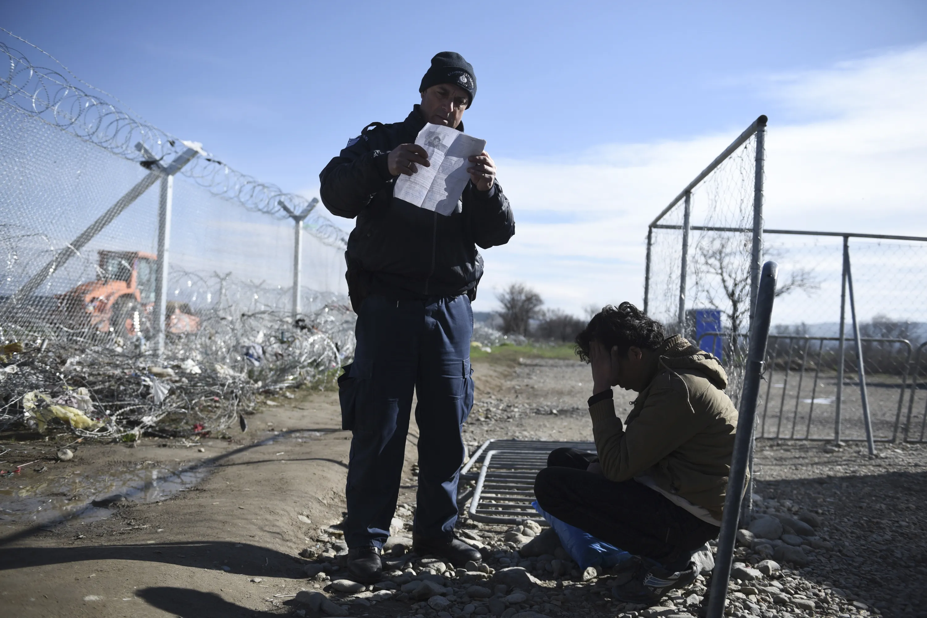 A Greek policeman checks documents of a man at the borderline with Macedonia near the northern Greek village of Idomeni, on Sunday, February 21, 2016. Macedonia has closed its southern border with Greece to Afghan migrants, allowing only Iraqis and Syrians, Greek police report. (Photo by Giannis Papanikos/AP Photo)