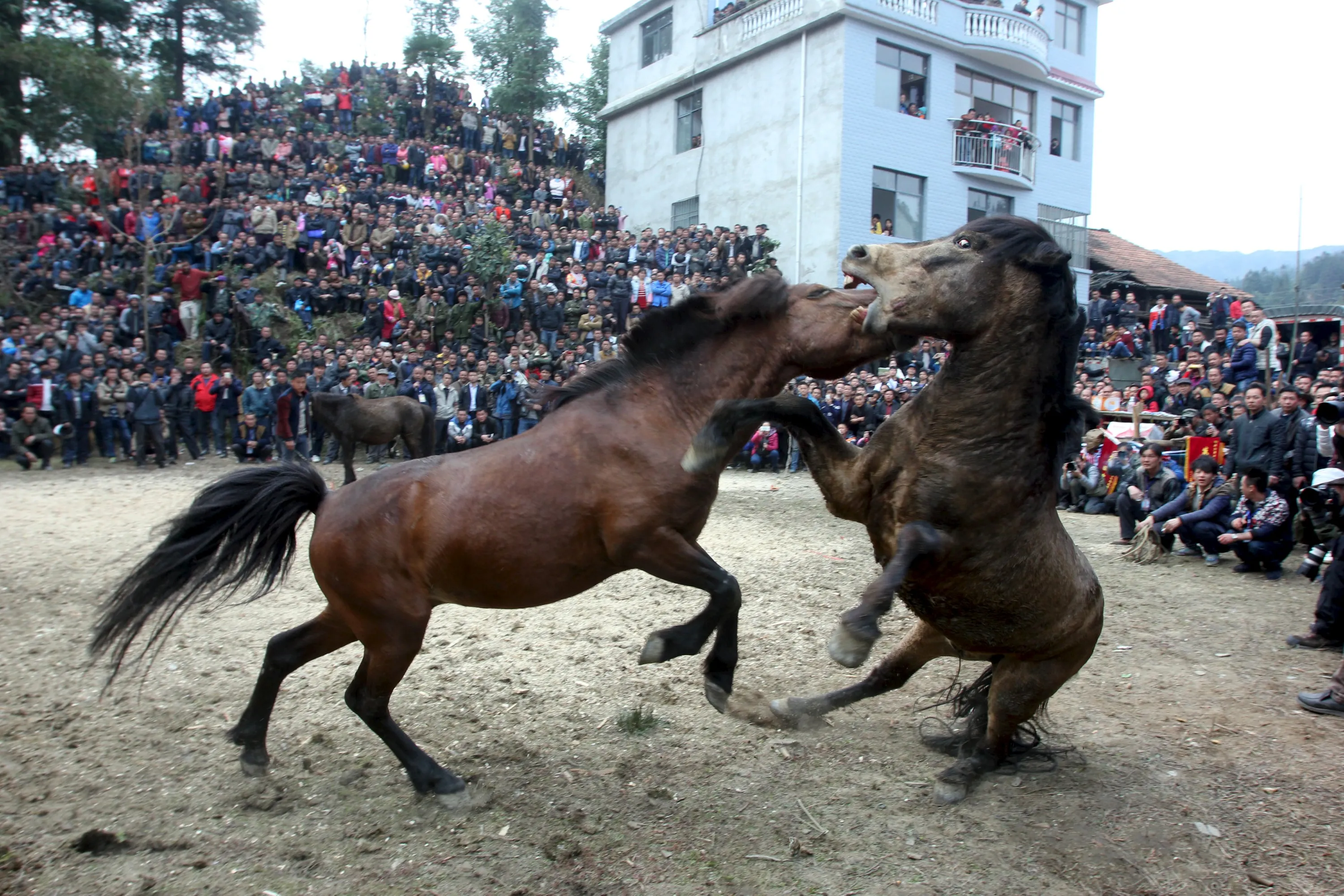 Two horses fight at an ethnic Miao's horse fighting event celebrating Chinese Lunar New Year in Liuzhou, Guangxi Zhuang Autonomous Region, Guangxi Zhuang Autonomous Region, China, February 20, 2016. (Photo by Reuters/Stringer)