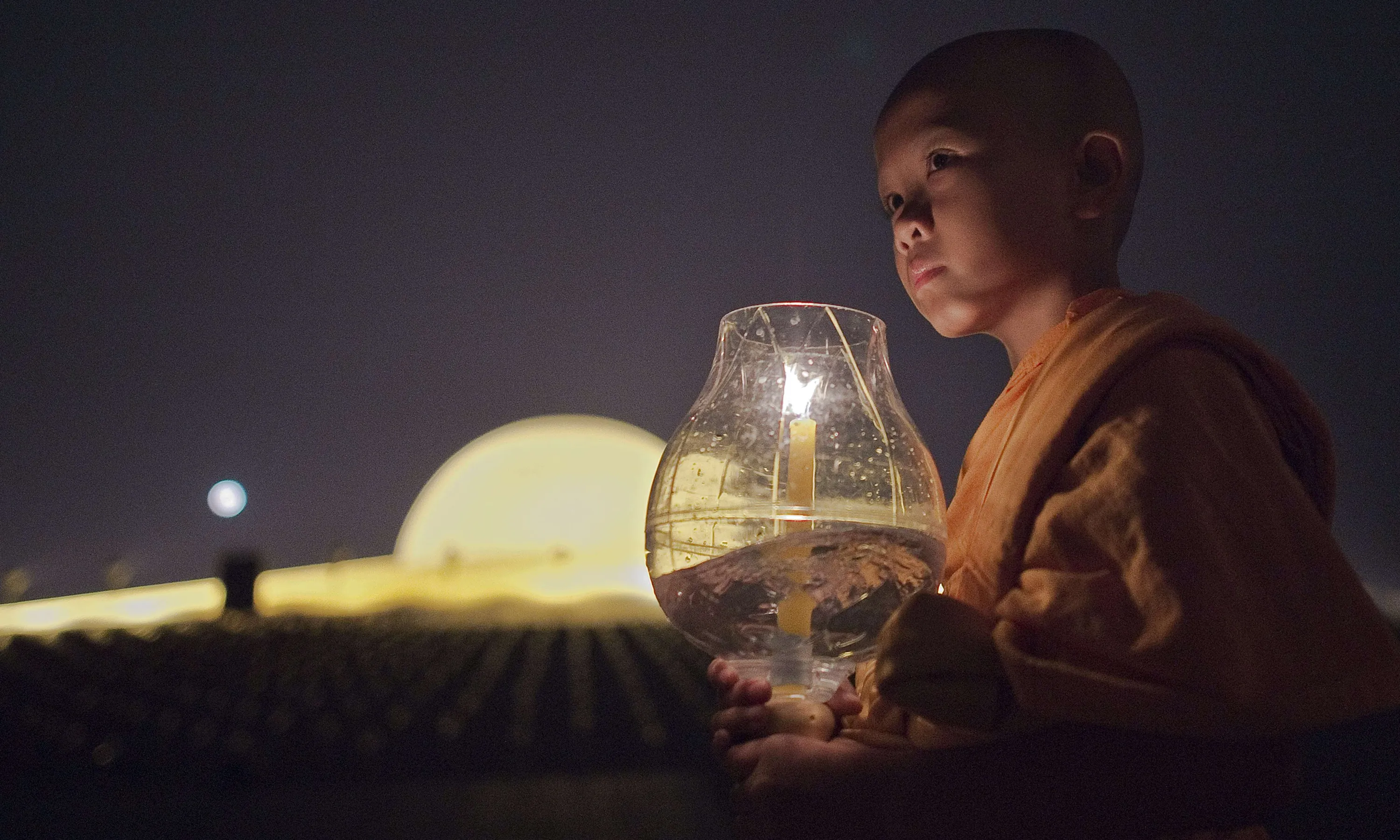 A Buddhist novice holds a candle during a ceremony at the Dhammakaya Temple in Bangkok on February 22, 2016 on the occasion of Makha Bucha day. The Makha Bucha festival is observed in Thailand on the full moon of the third lunar month and commemorates the day when 1,250 monks gathered to be ordained by the Buddha. (Photo by Nicolas Asfouri/AFP Photo)