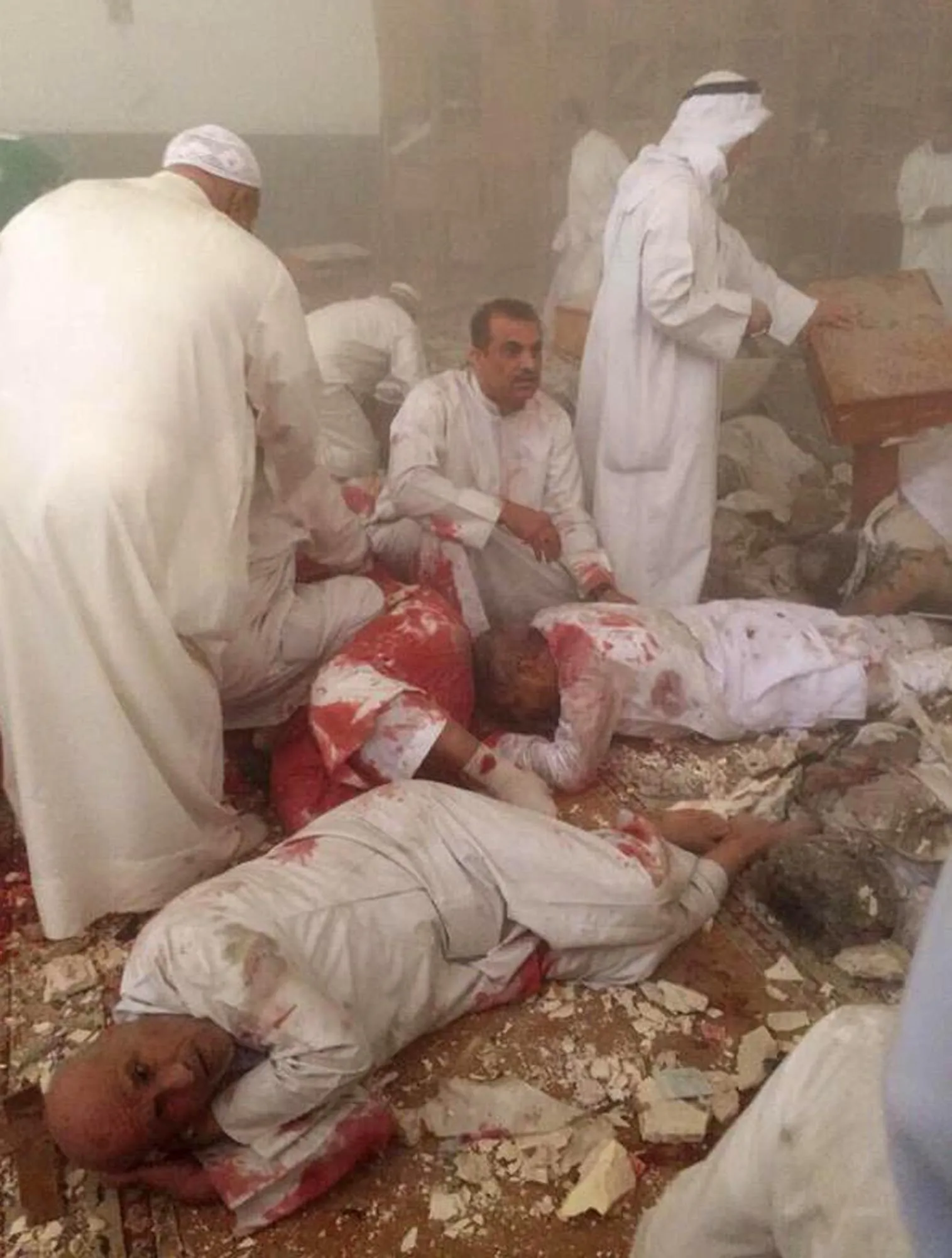 In this June 26, 2015 file photo provided by Kuwaitna news shows injured people in the immediate aftermath of a deadly blast at a Shiite mosque, claimed by the Islamic State group, in Kuwait City. Twenty five years after the first U.S. Marines swept across the border into Kuwait in the 1991 Gulf War, American forces find themselves battling the extremist Islamic State group, born out of al-Qaida, in the splintered territories of Iraq and Syria. (Photo by Kuwaitna News via AP Photo)