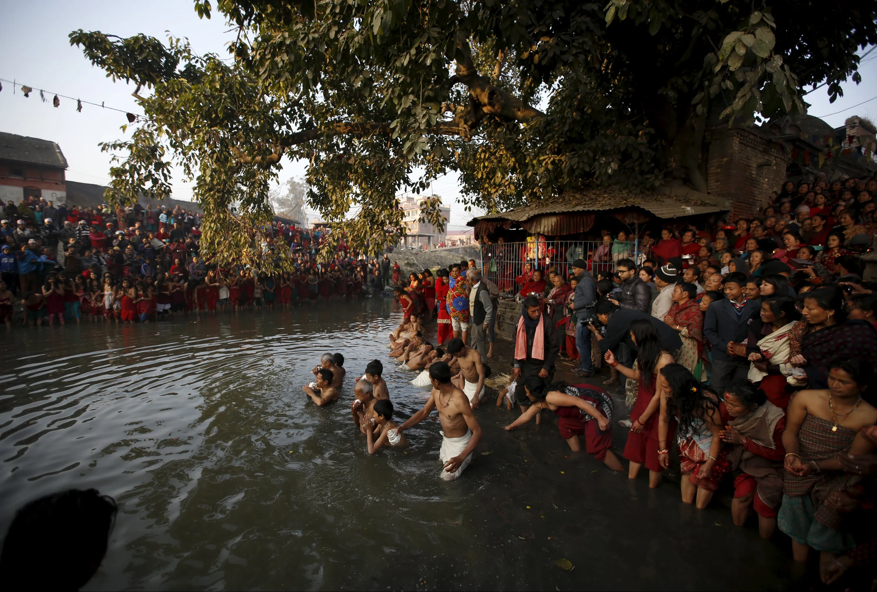 Devotees offer prayers by taking a bath in the Hanumante River, on the final day of the month-long Swasthani Brata Katha festival in Bhaktapur, Nepal, February 22, 2016. (Photo by Navesh Chitrakar/Reuters)