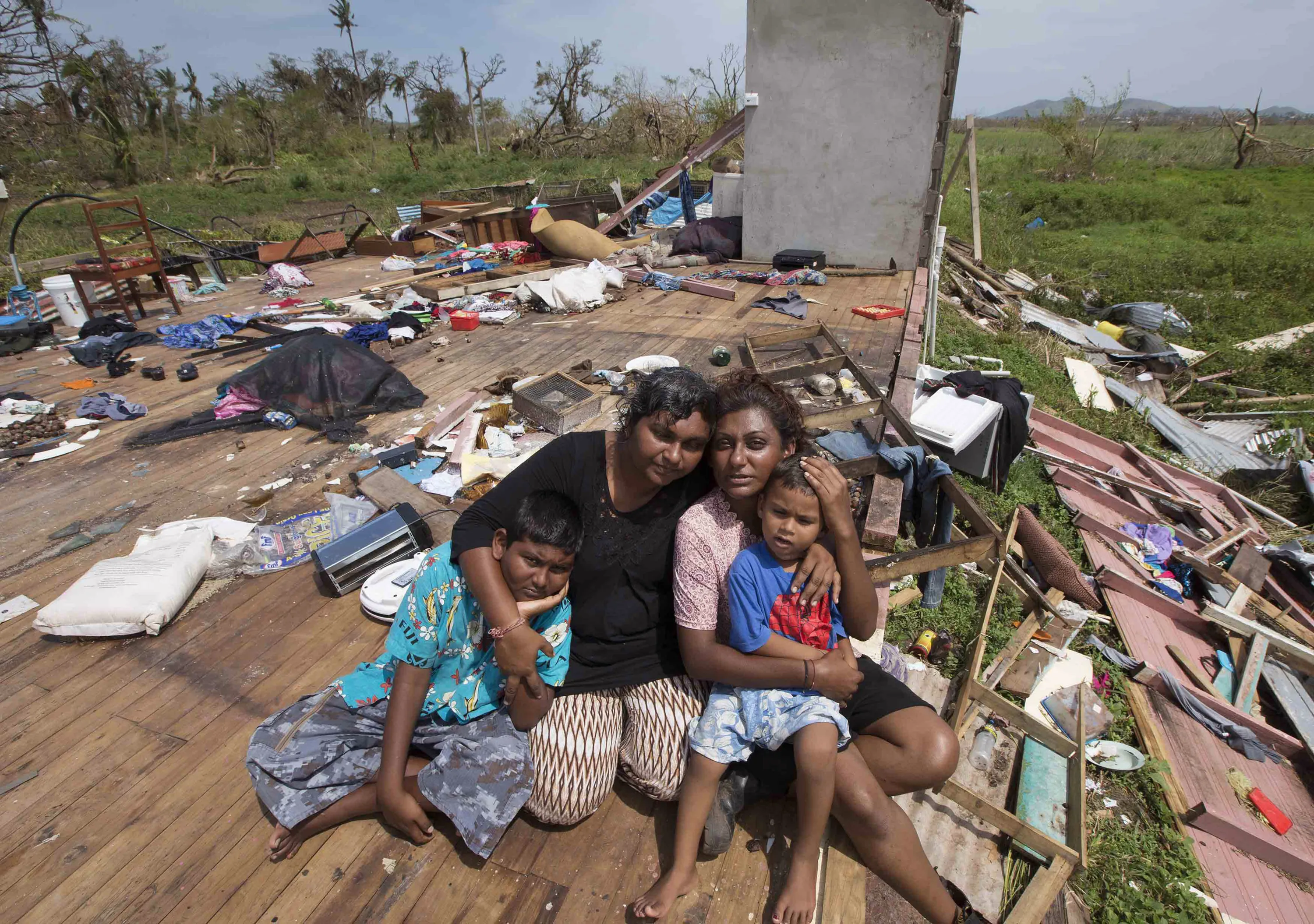 Sanjogeeta Kiran, right, with her sister Sulva Kiran, second left, and her children Shivendera, left, and Raajeen, sit amid the debris of their home in RakiRaki, Fiji, Wednesday, February 24, 2016, after cyclone Winston ripped through the island nation. (Photo by Brett Phibbs/New Zealand Herald via AP Photo)