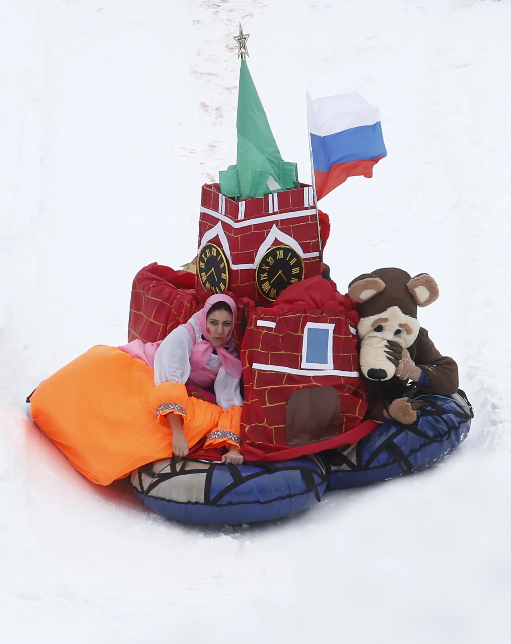 Participants compete during a contest on the longest distance and the most creative performance at the “Battle sani” (Sledge battle) festival of self-made sledges in Moscow, Russia, February 23, 2016. (Photo by Maxim Zmeyev/Reuters)