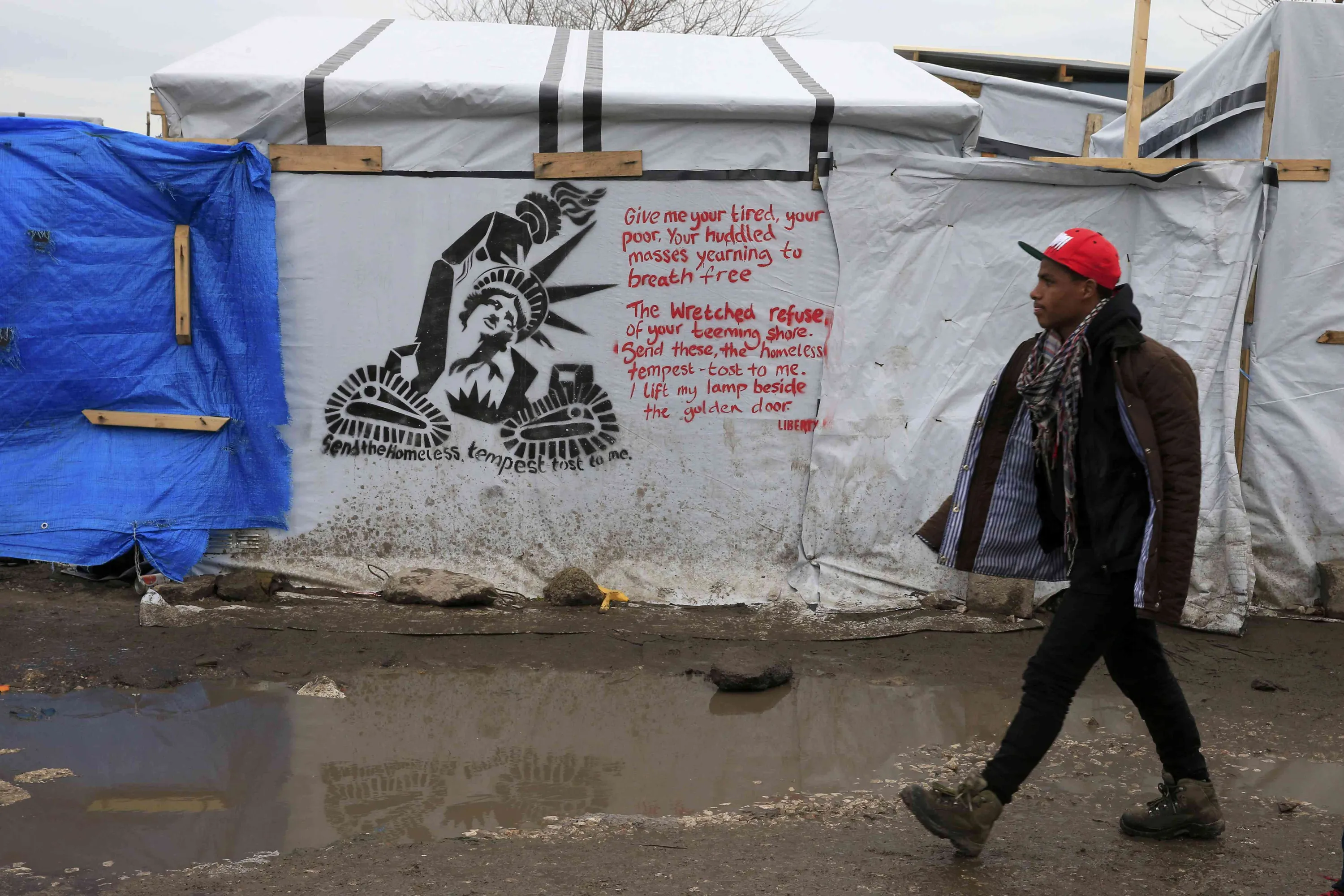 A migrant walks past a stencil graffiti with a statue of liberty and the message, “Send the Homless, Tempest tost to me”, in the southern part of a camp for migrants called the “jungle”, in Calais, northern France, February 23, 2016. French authorities have asked migrants living in tents and makeshift shelters in the southern sector of the “jungle”, to evacuate the area. (Photo by Pascal Rossignol/Reuters)