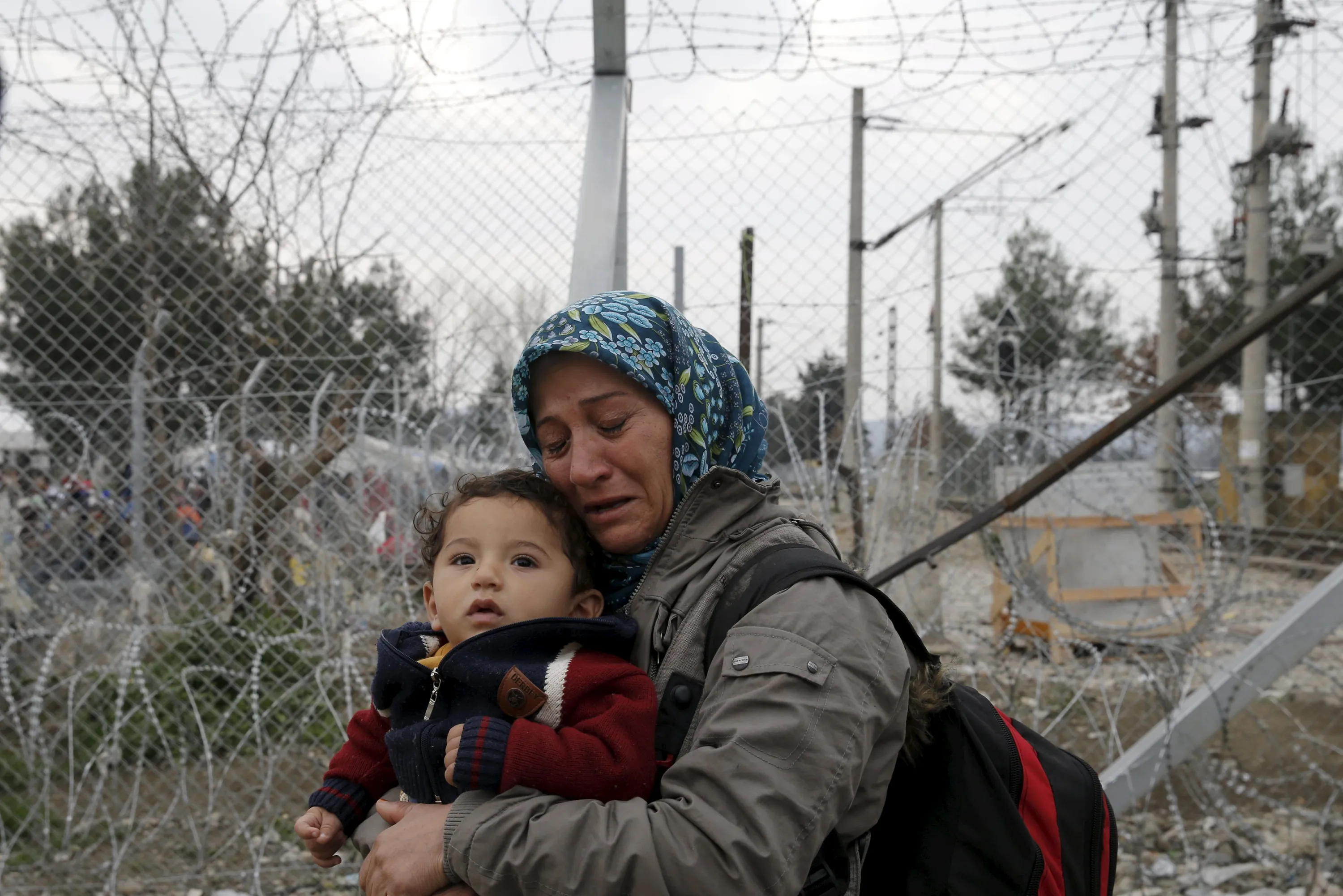 A migrant holding a child cries next to a border fence at the Macedonian-Greek border in Gevgelija, Macedonia February 24, 2016. (Photo by Marko Djurica/Reuters)