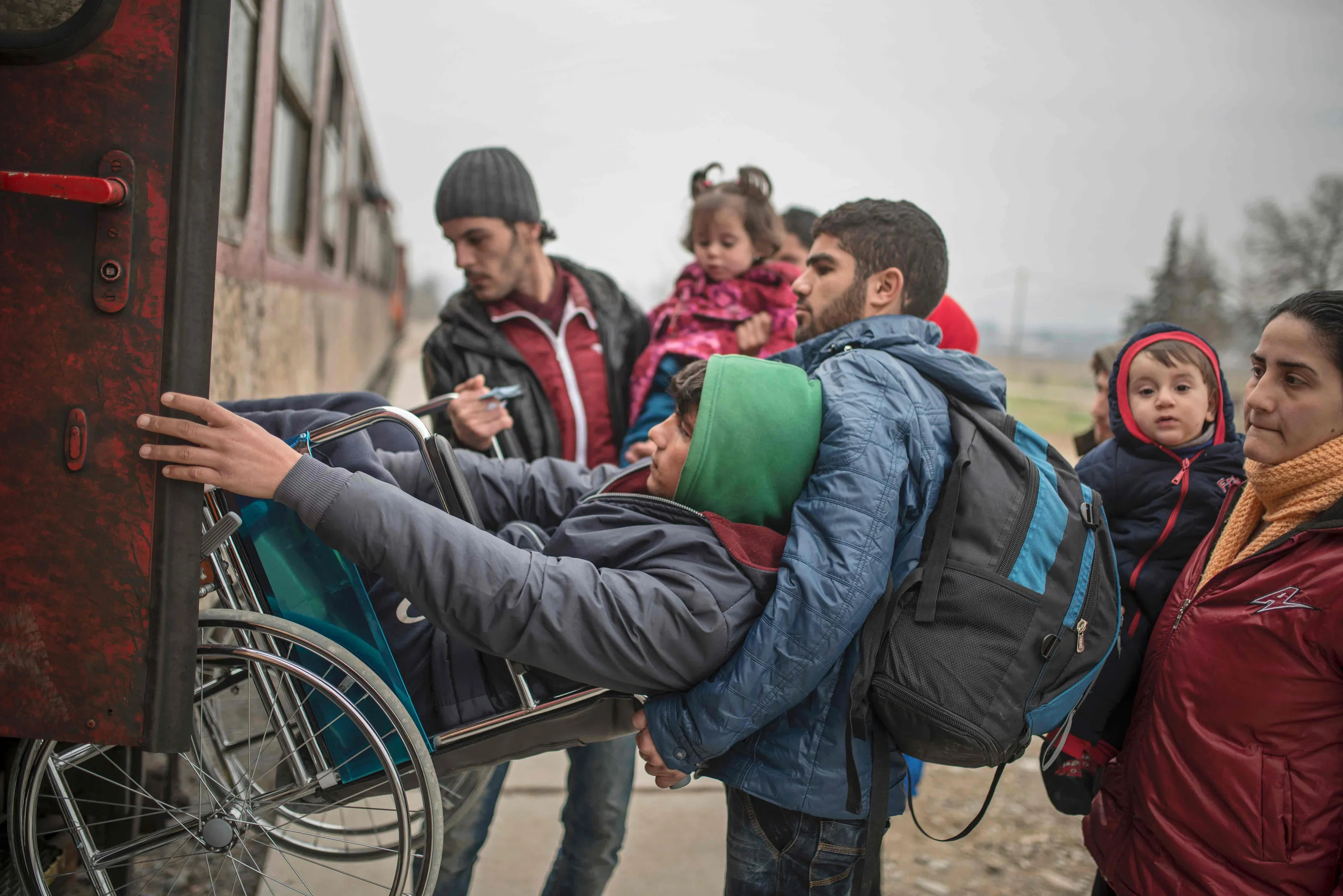 A man helps another young man in a wheelchair as migrants and refugees board a train after crossing the Greek-Macedonian border, near Gevgelija, on February 24, 2016. Balkan countries along the well-trodden migrant path towards northern Europe met on February 24 to explore ways to stem the flow despite growing fears that tighter controls will spark a humanitarian crisis, particularly in Greece. In the latest such move, Macedonia has closed its frontier to Afghans and introduced more stringent document checks for Syrians and Iraqis seeking to travel to northern and western Europe. The restrictions have caused a bottleneck of thousands of people at the Greek-Macedonian border. (Photo by Robert Atanasovski/AFP Photo)