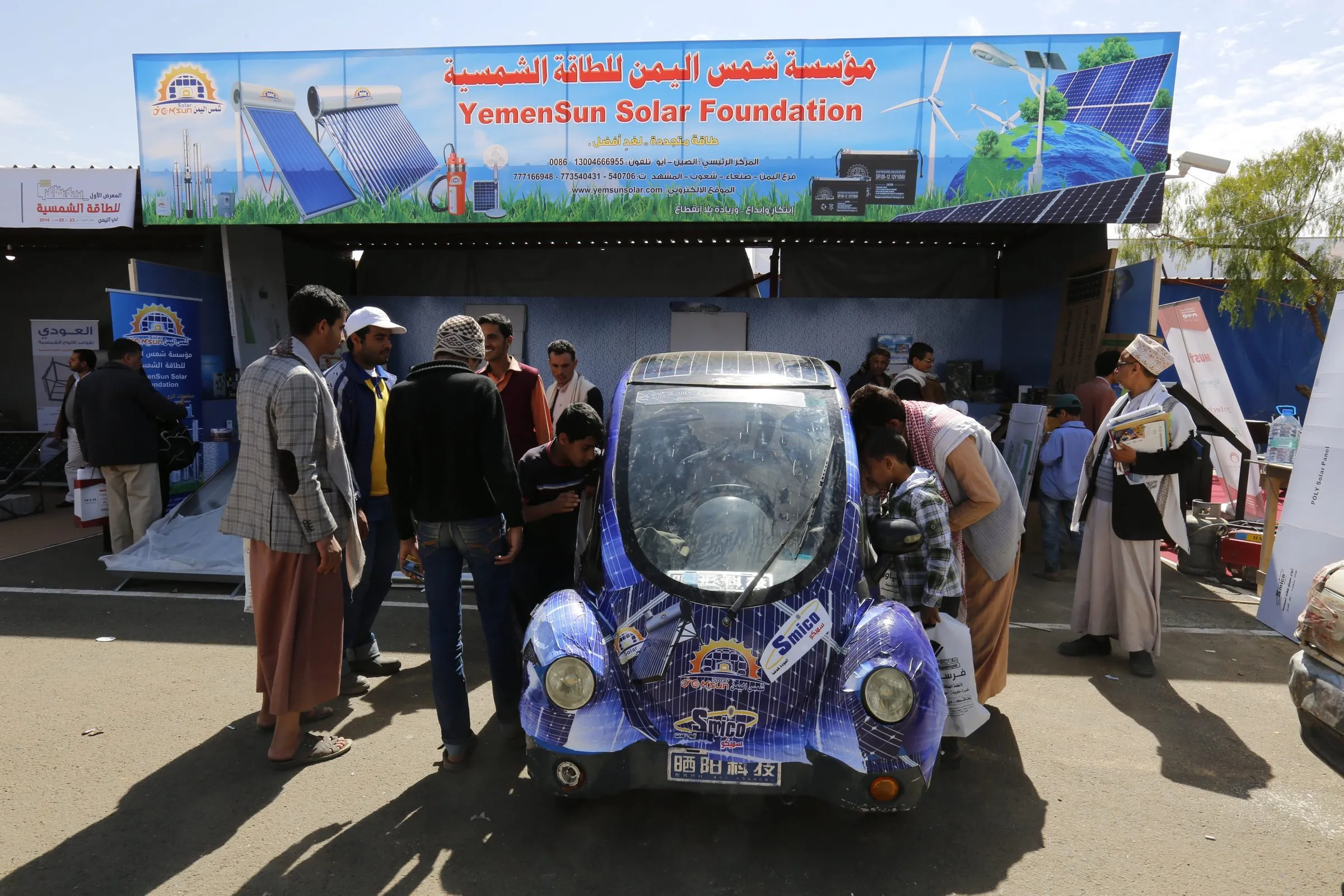 Yemenis gather around a solar powered car as they visit a solar panel fair in Sana'a, Yemen, 23 February 2016. Many Yemenis have turned to the sun as alternative nergy source to power their homes, since the ten-month conflict caused many cities of Yemen, including the capital Sana'a, to completely lose means of generating electricity. (Photo by Yahya Arhab/EPA)