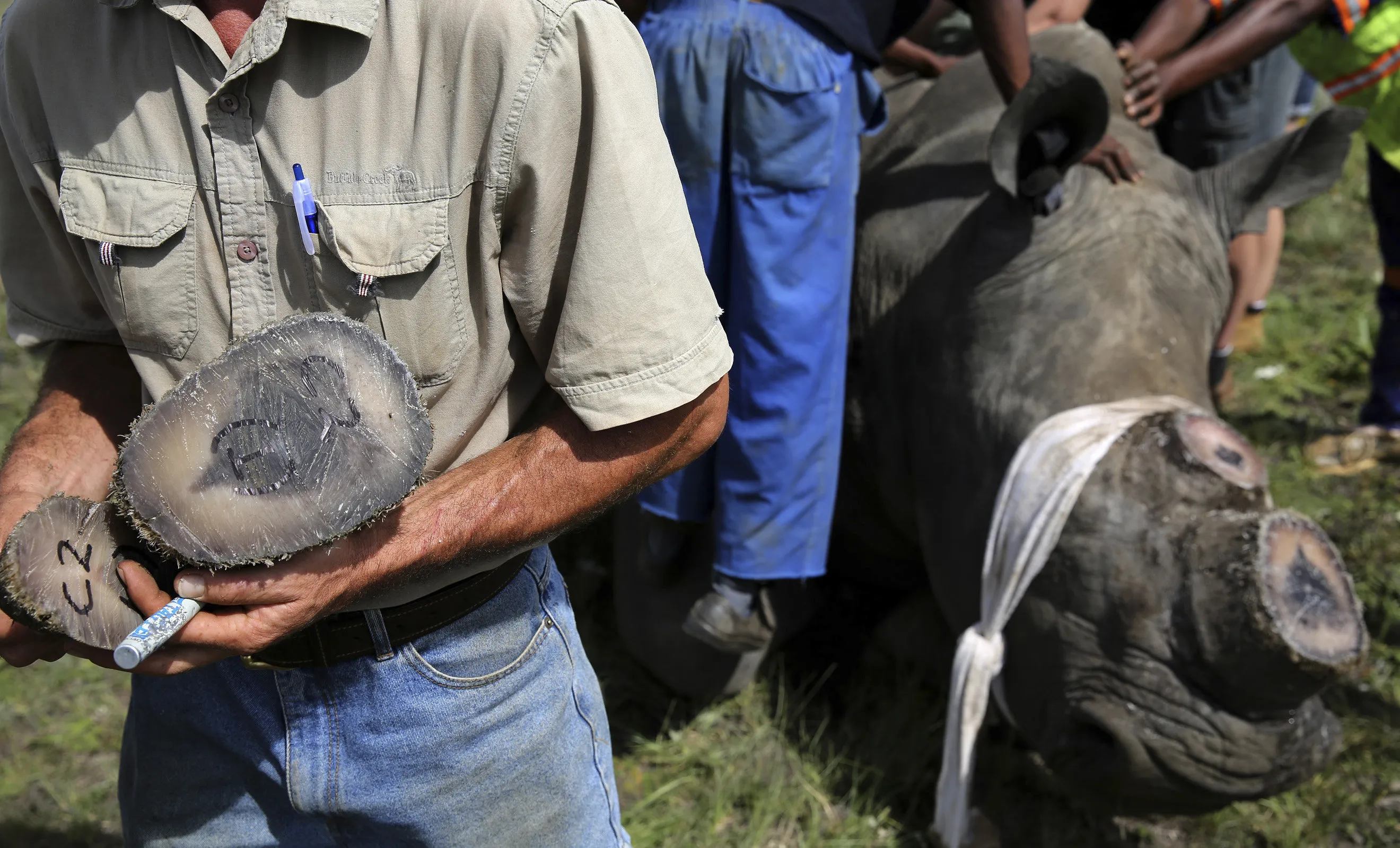 A worker holds rhino horns after it was dehorned in an effort to deter the poaching of one of the world's endangered species, at a farm outside Klerksdorp, in the north west province, South Africa,February 24, 2016. (Photo by Siphiwe Sibeko/Reuters)