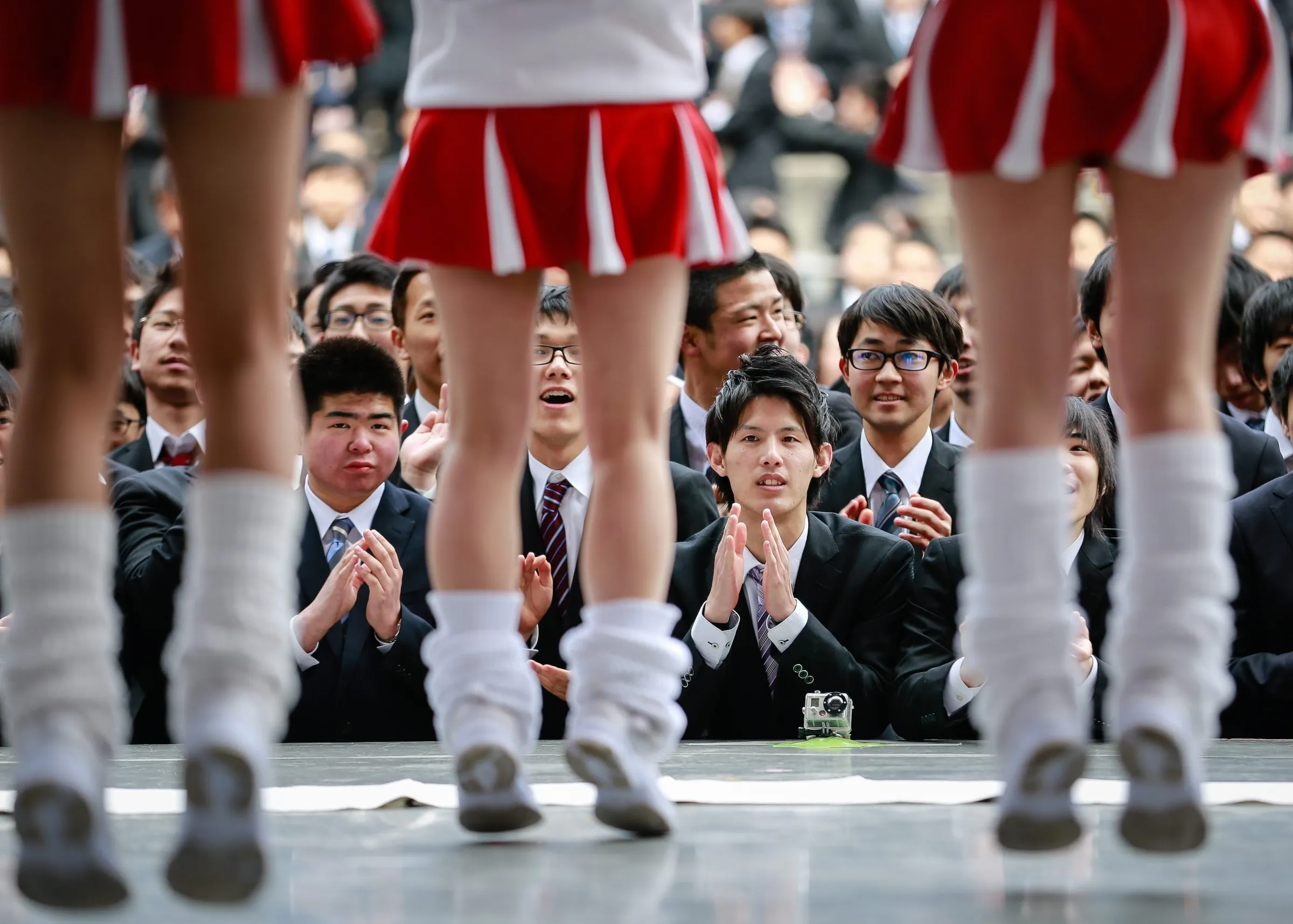 Japanese college graduates watch cheerleaders on stage during a job hunting rally at a park in downtown Tokyo, Japan, 25 February 2016. Some 1,500 college graduates from various Japanese vocational schools attended the pep rally in an effort to gain positive enthusiasm for the upcoming job hiring season in Japan. (Photo by Christopher Jue/EPA)