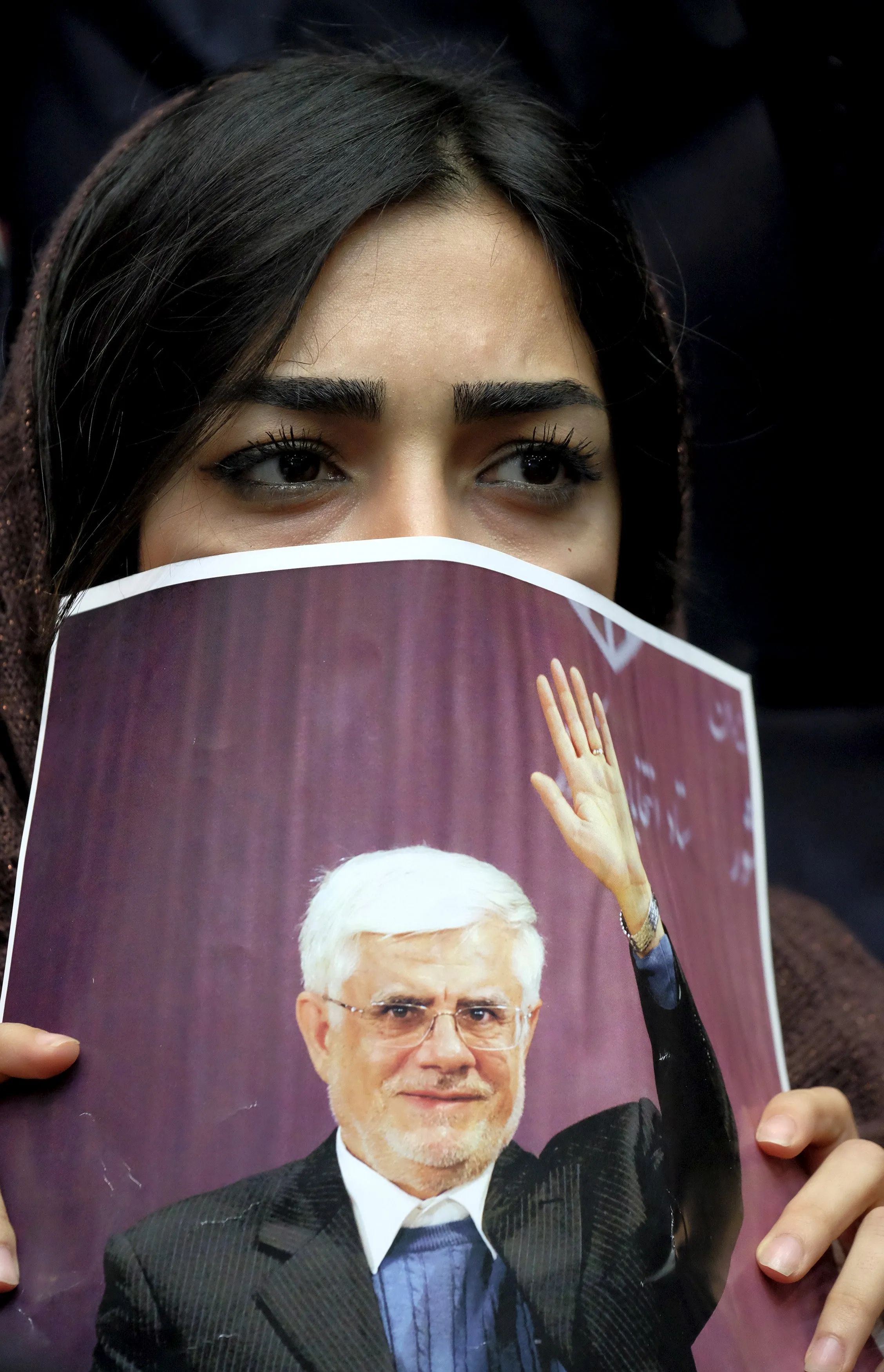 A supporter of Iranian former vice-president Mohammad Reza Aref, a candidate for the upcoming parliamentary elections, holds his picture during a reformist campaign in Tehran February 20, 2016. (Photo by Raheb Homavandi/Reuters/TIMA)