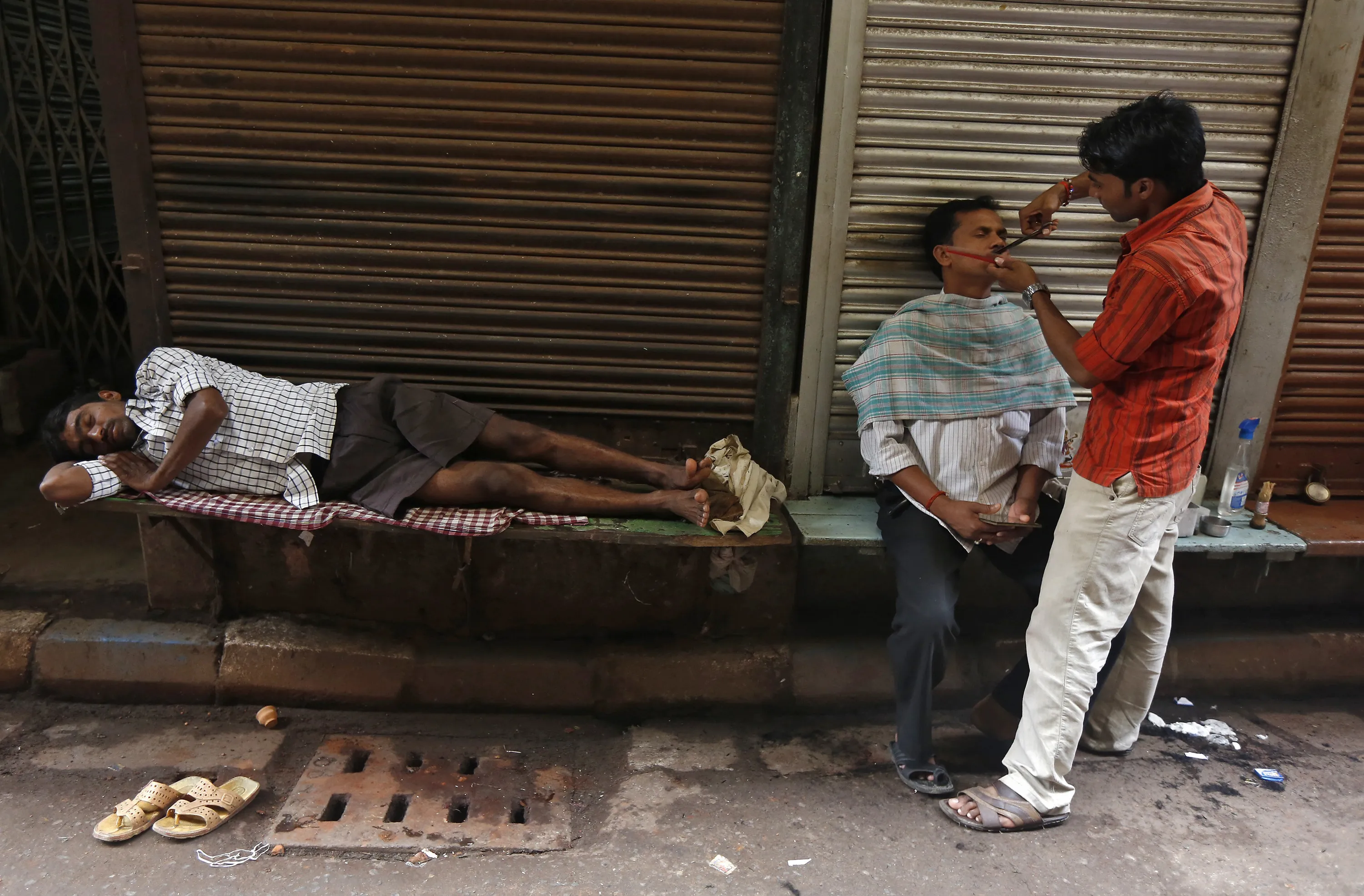 A man gets his moustaches trimmed by a roadside barber as another rests at a market in Kolkata, India, February 26, 2016. (Photo by Rupak De Chowdhuri/Reuters)