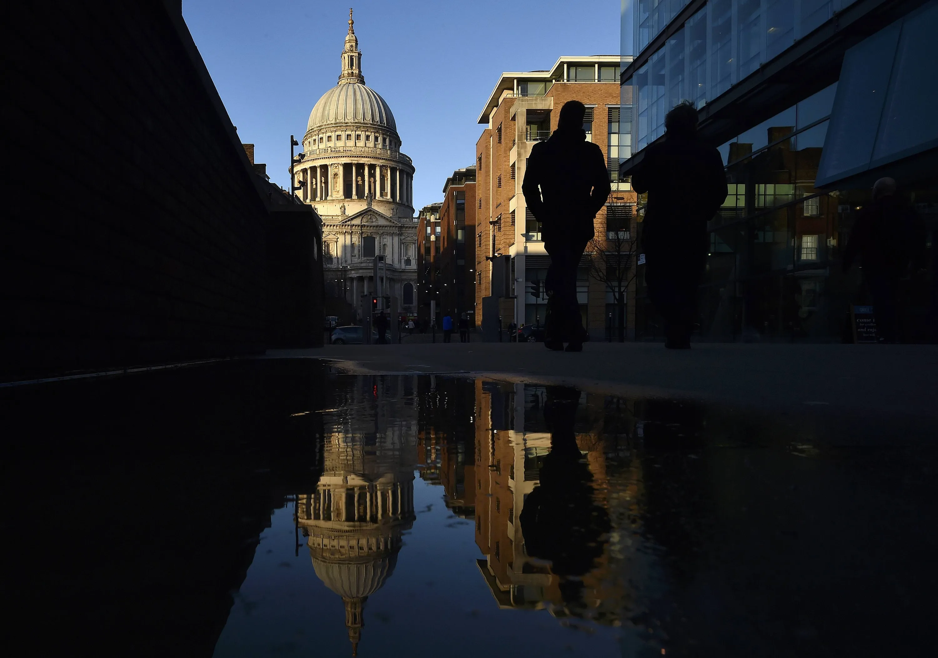 Pedestrians are reflected in a puddle as they walk towards St Paul's Cathedral in London, Britain January 7, 2016. (Photo by Toby Melville/Reuters)