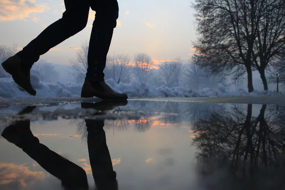 A woman is reflected in a small pound as she walks along a street in the town of Tuzla, 120 kms north of Sarajevo, Bosnia, Sunday, January 10, 2016. (Photo by Amel Emric/AP Photo)