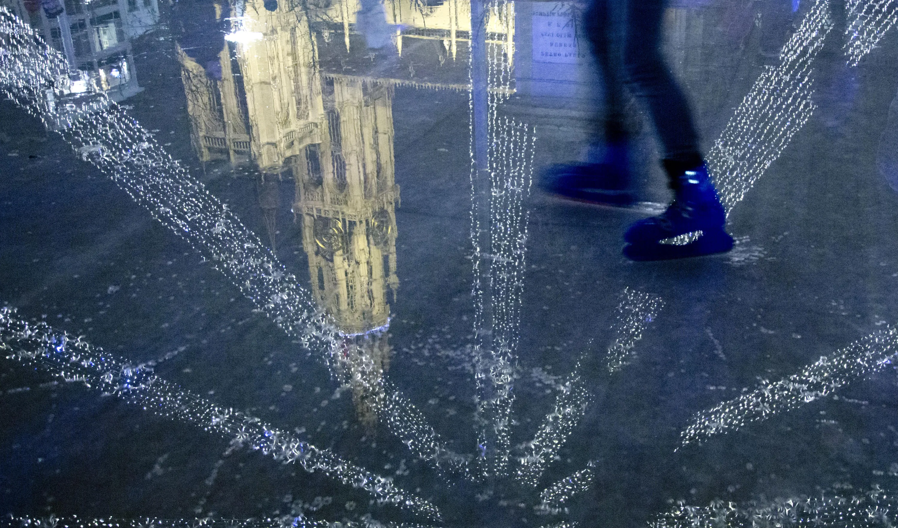 A skater skates through the reflection of the Antwerp Cathedral on the water of an ice skating rink at a Christmas market in the historical Grote Markt of Antwerp, Belgium on Tuesday, December 22, 2015. Warmer than normal temperatures for December caused the ice skating rink to melt. (Photo by Virginia Mayo/AP Photo)