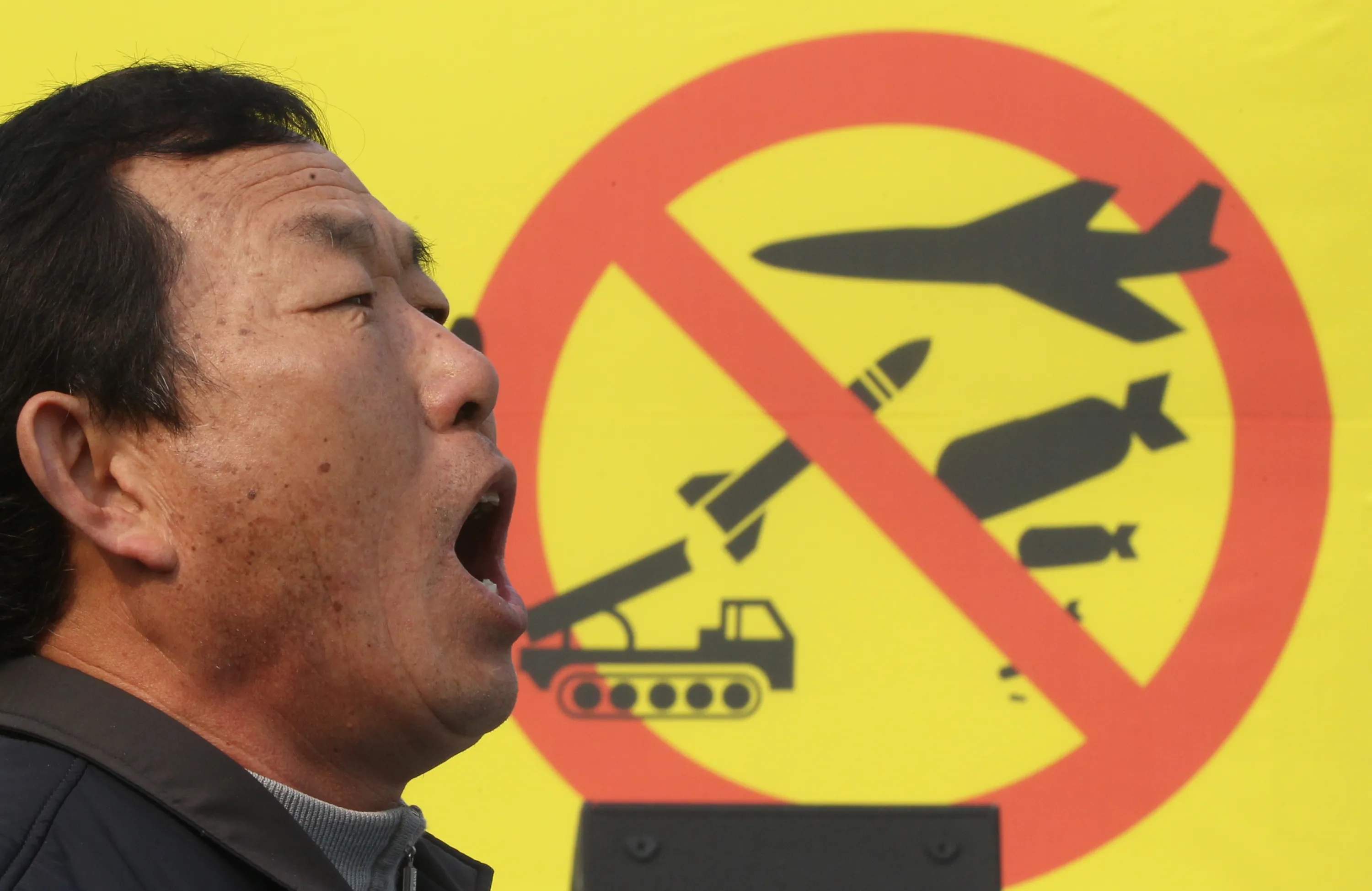 A South Korean anti-war protester yells during a rally demanding a restart of six-party talks and to stop the sanction near the government complex in Seoul, South Korea, Saturday, February 27, 2016. The United States on Thursday introduced a draft U.N. Security Council resolution that it said will significantly increase pressure on North Korea in response to its latest nuclear test and rocket launch. (Photo by Ahn Young-joon/AP Photo)
