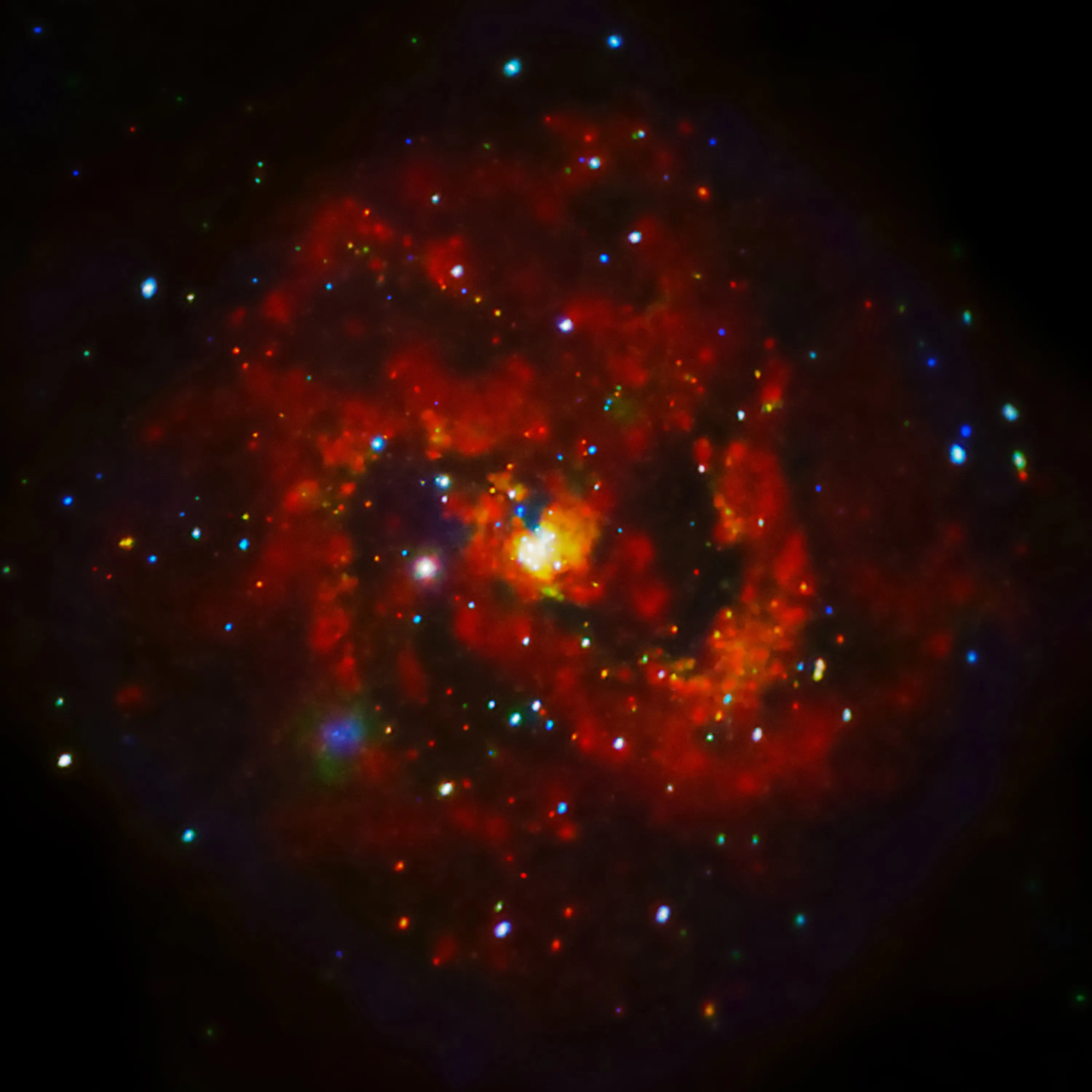 M83, a spiral galaxy about 15 million light years from Earth, is one of the deepest X-ray observations ever made of a supernova from a spiral galaxy beyond our own. This full-field view of the spiral galaxy shows the low, medium, and high-energy X-rays observed in red, green, and blue respectively. The distribution of X-rays with energy suggests that SN 1957D contains a neutron star, a rapidly spinning, dense star formed when the core of pre-supernova star collapsed. This neutron star, or pulsar, may be producing a cocoon of charged particles moving at close to the speed of light known as a pulsar wind nebula. If this interpretation is confirmed, the pulsar in SN 1957D is observed at an age of 55 years, one of the youngest pulsars ever seen. (Photo by Reuters/NASA)