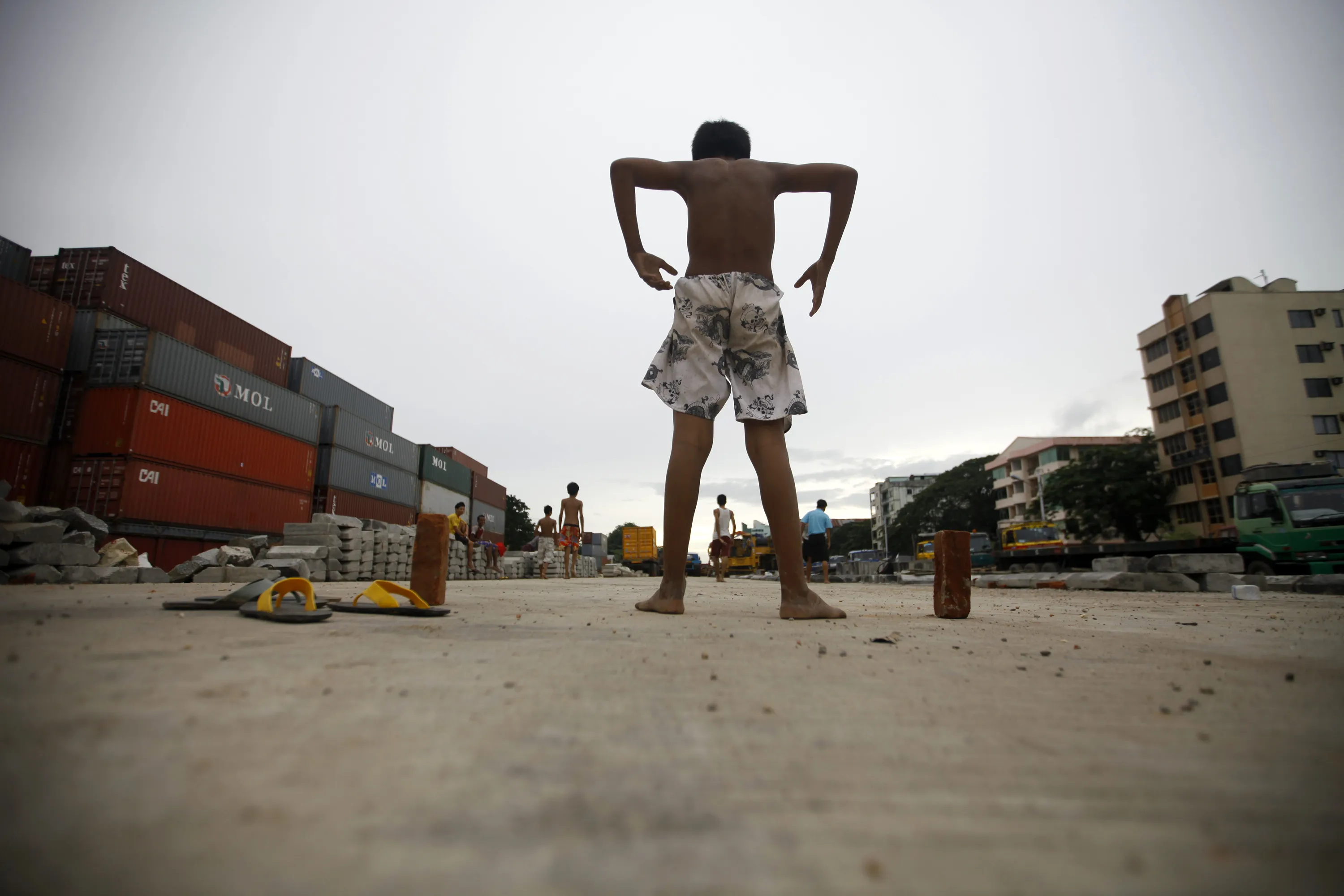 A boy stands as a goal keeper as children play soccer on a road in Yangon, Myanmar, July 15, 2012. (Photo by Soe Zeya Tun/Reuters)