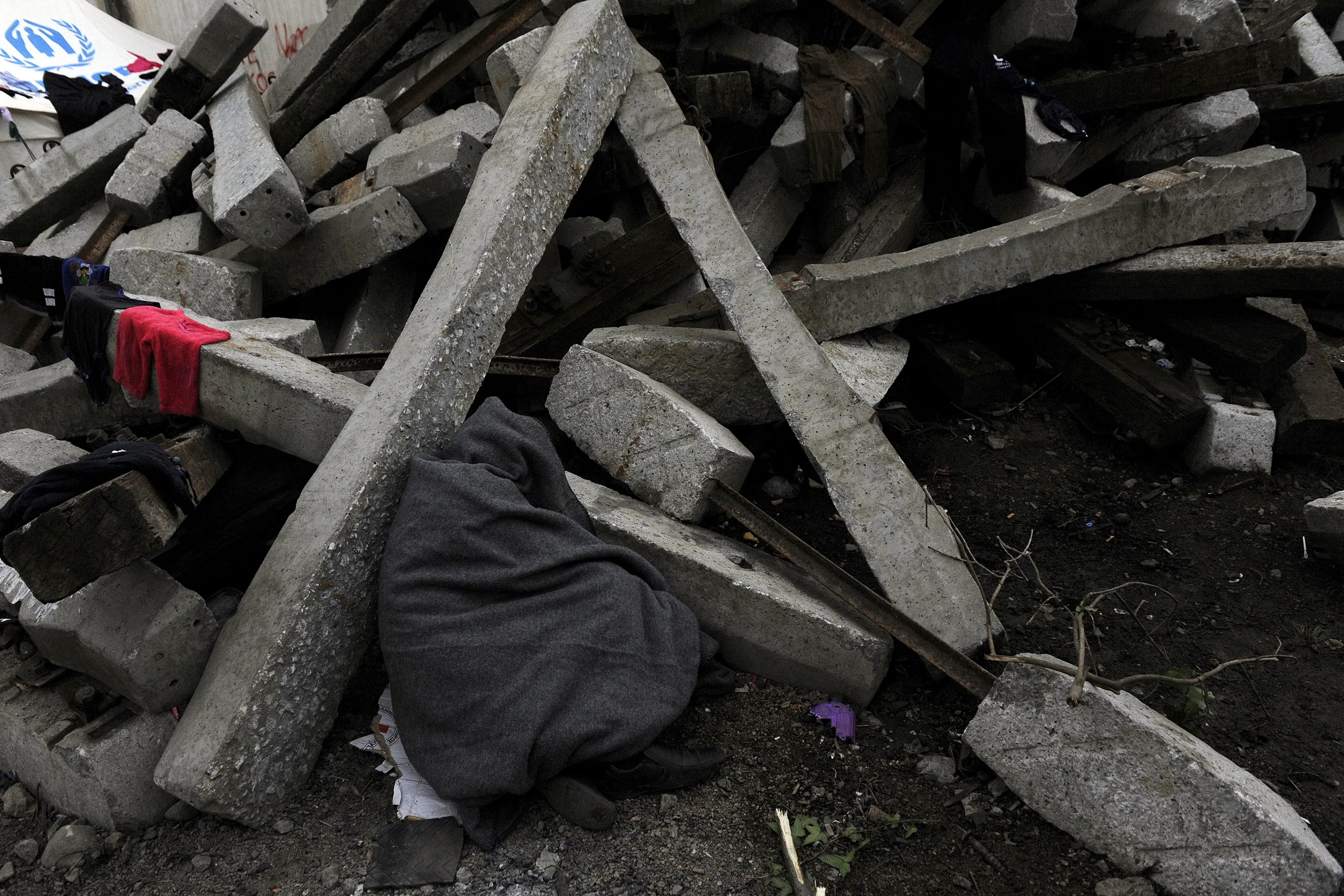 A refugee sleeps next to debris at a makeshift camp set up by stranded refugees and migrants who are waiting to cross the Greek-Macedonian border, near the Greek village of Idomeni, February 29, 2016. (Photo by Alexandros Avramidis/Reuters)
