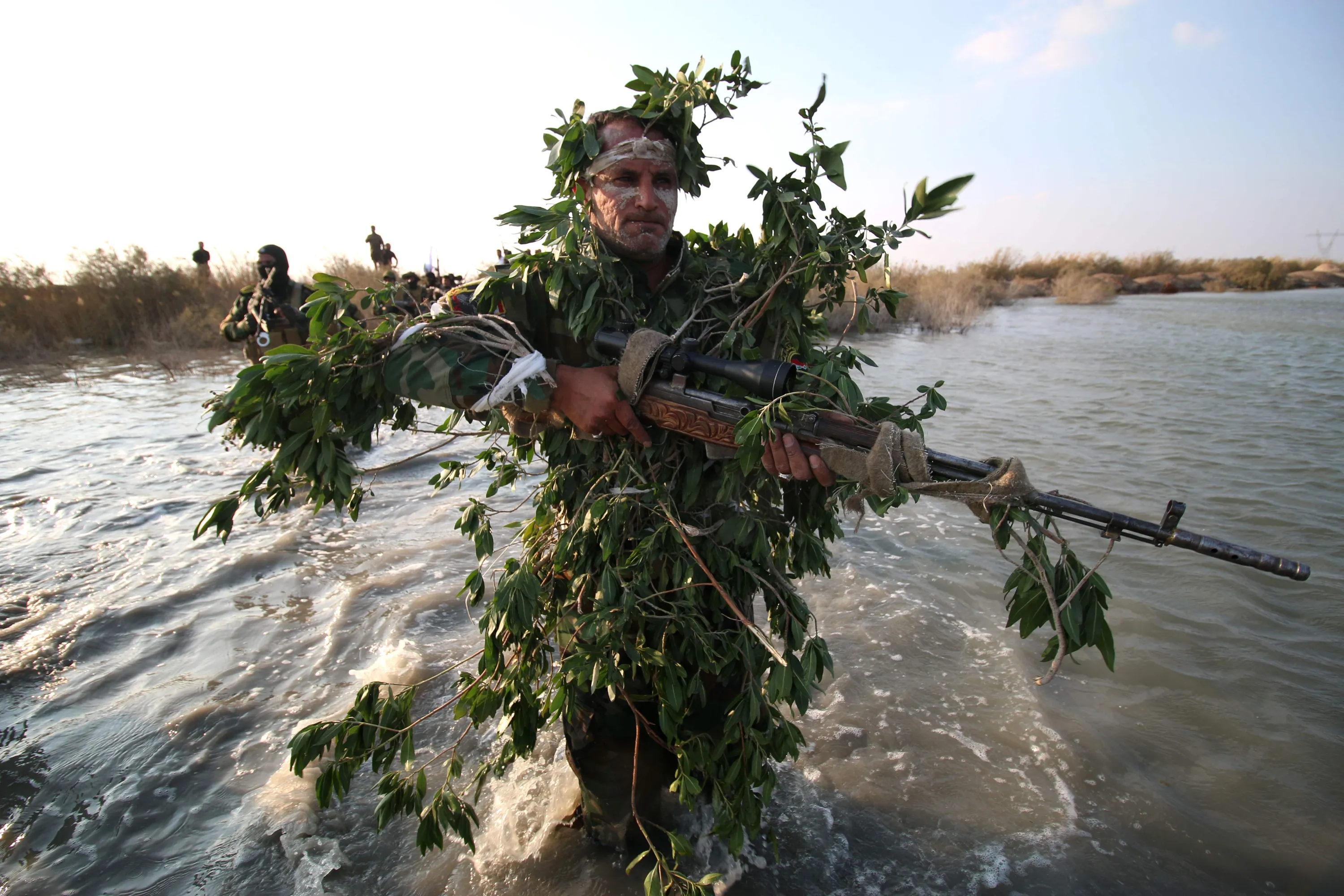 A member of the Saraya al-Salam (Peace Brigades), a group formed by Iraqi Shiite Muslim cleric Moqtada al-Sadr, takes part in a military training session in the town of al-Zubair, near the southern port city of Basra, on February 29, 2016. (Photo by Haidar Mohammed Ali/AFP Photo)
