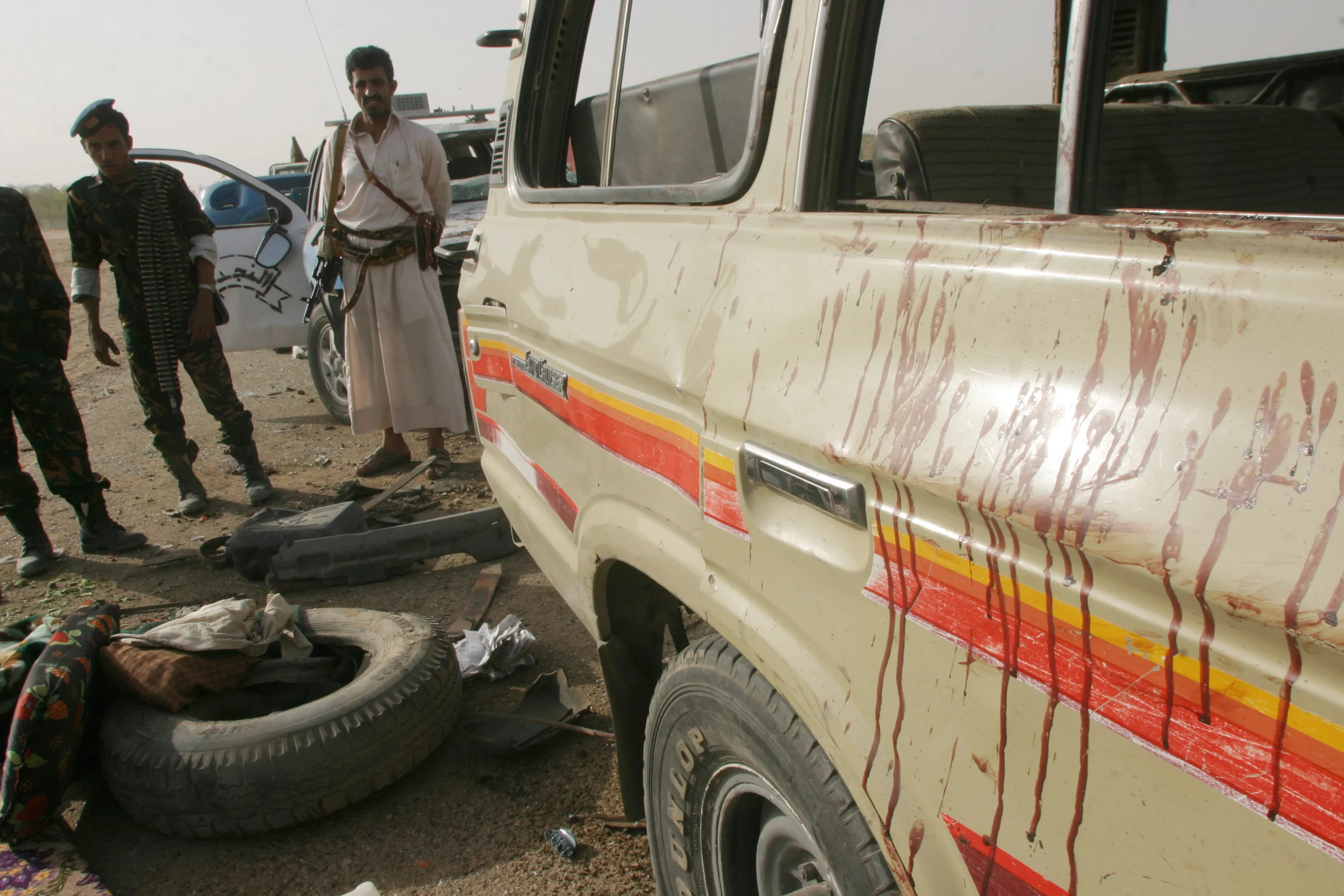 Viewed by Western analysts as the most dangerous arm of al Qaeda, AQAP claimed responsibility for the deadly January 2015 attack in Paris on the satirical French magazine Charlie Hebdo. Caption: Policemen stand by a tourist's car at the site of a suspected al-Qaeda car bomb attack in the Yemeni province of Marib July 3, 2007. (Photo by Khaled Abdullah/Reuters)