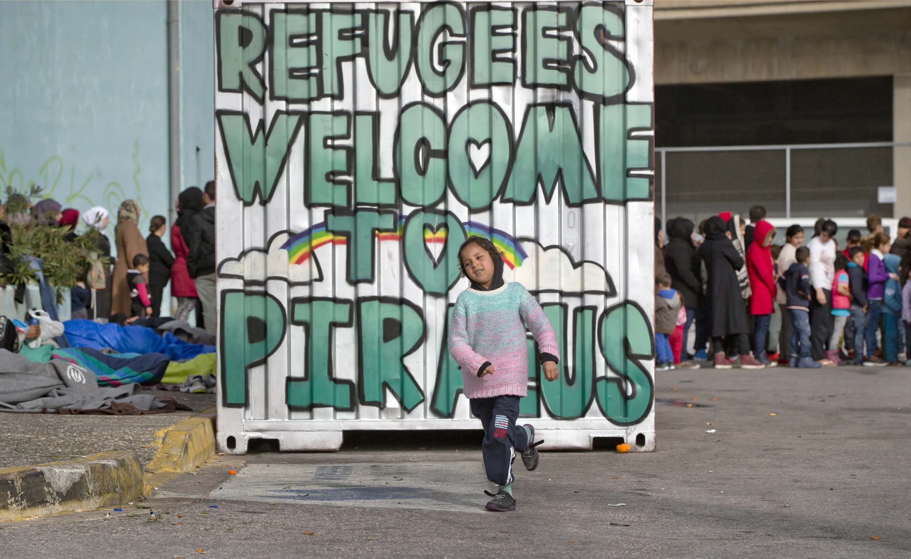 A child by a painted container as people wait in line for food handouts outside an overcrowded shelter area for migrants at the Athens' port of Piraeus, Greece, Tuesday, March 1, 2016. (Photo by Vadim Ghirda/AP Photo)