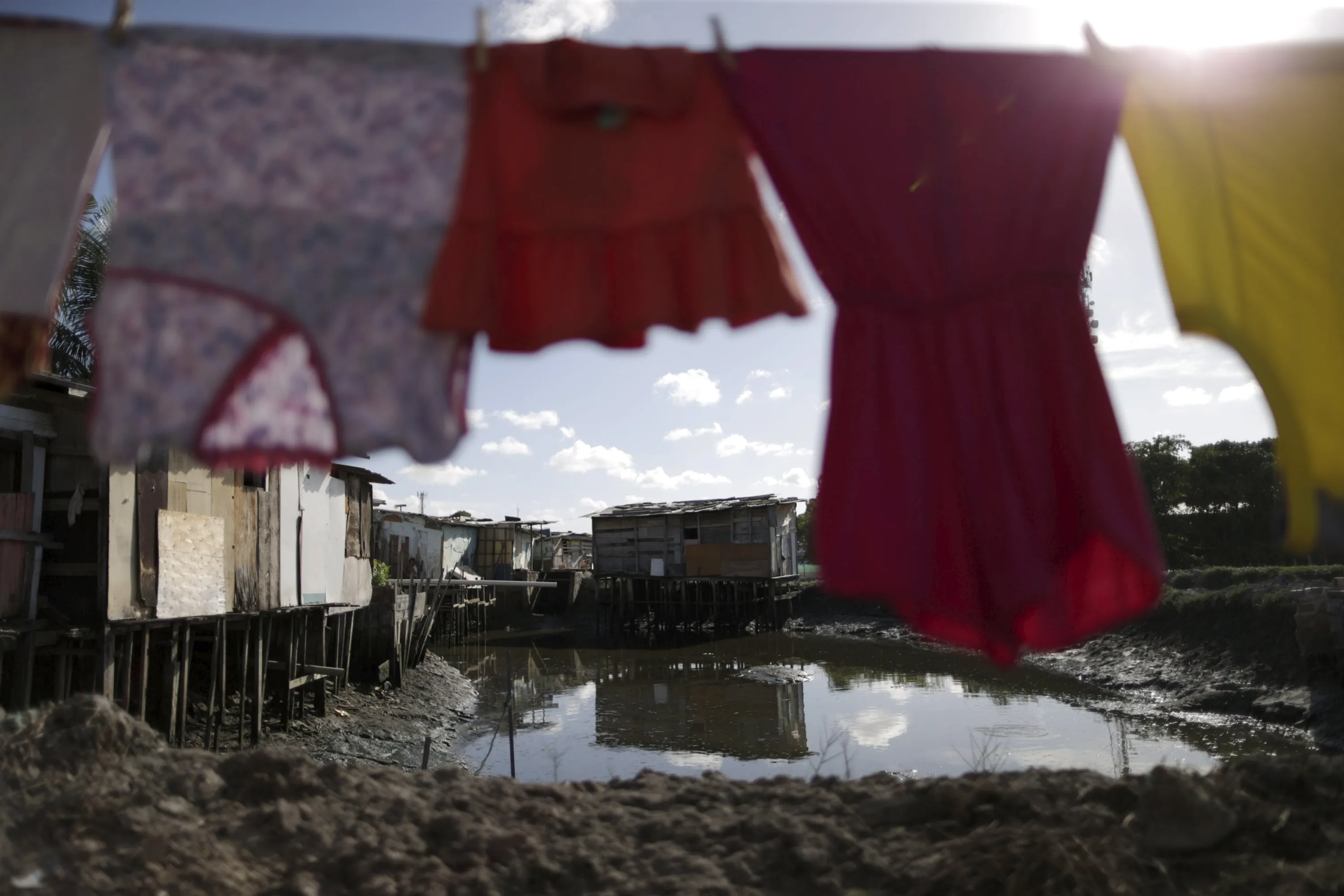 Laundry hangs on a clothesline in front of houses at a lake dwelling also known as or palafitte or “Palafito” in Recife, Brazil, March 1, 2016. (Photo by Ueslei Marcelino/Reuters)