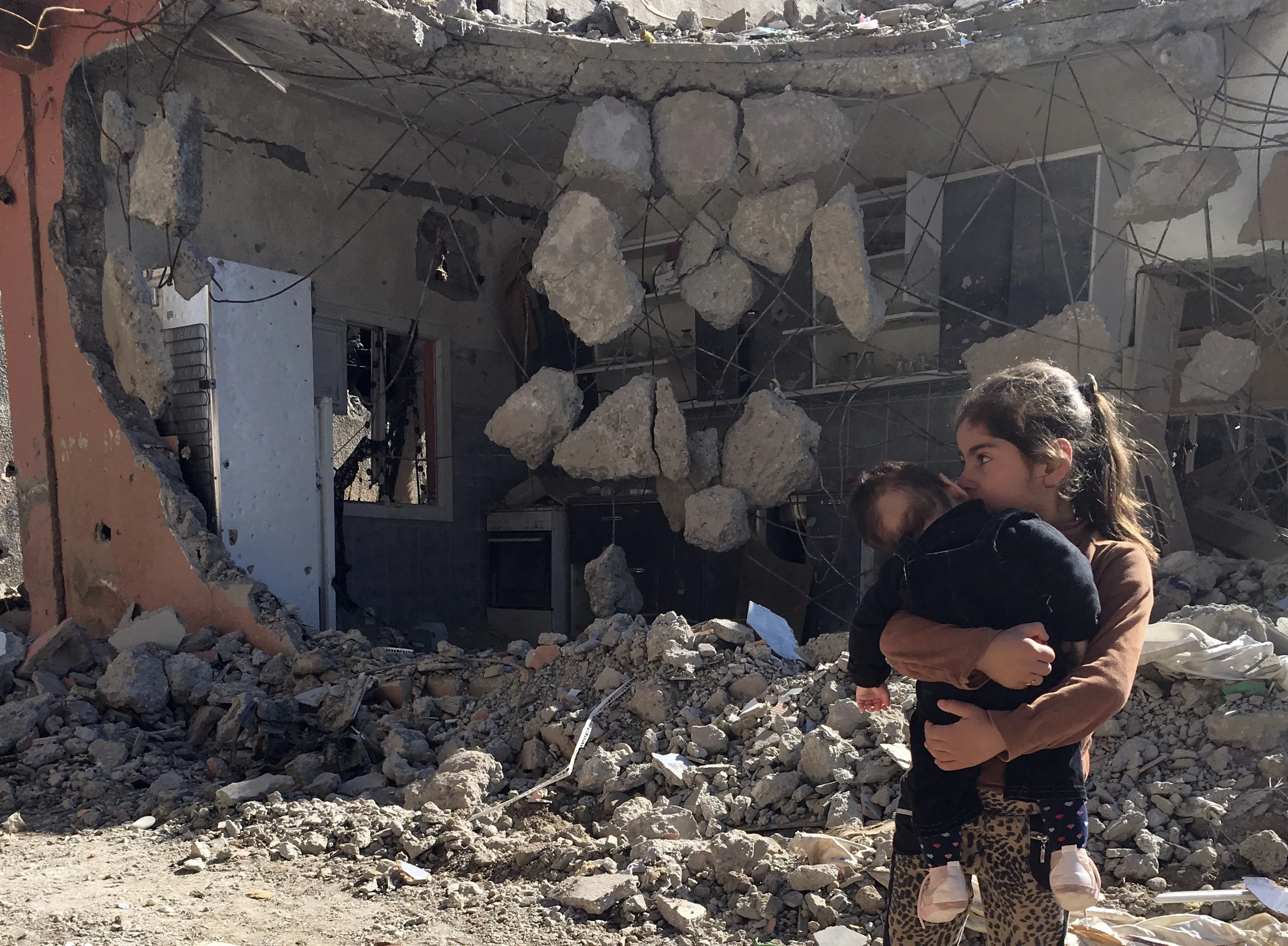 A young girl holds a child in front of a ruined house in Cizre, Turkey, Wednesday, March 2, 2016. Turkish authorities on Wednesday scaled down a 24-hour curfew imposed on the mainly Kurdish town of Cizre in southeast Turkey, nearly three weeks after declaring the successful conclusion of military operations there. The stench of death and the smell of gunpowder rose from mounds of rubble Wednesday as residents of the Turkish town of Cizre returned to find many of their homes obliterated amid Turkey's efforts to crush Kurdish militants. At least one body was still lying inside a ruined house. (Photo by Ayse Wieting/AP Photo)