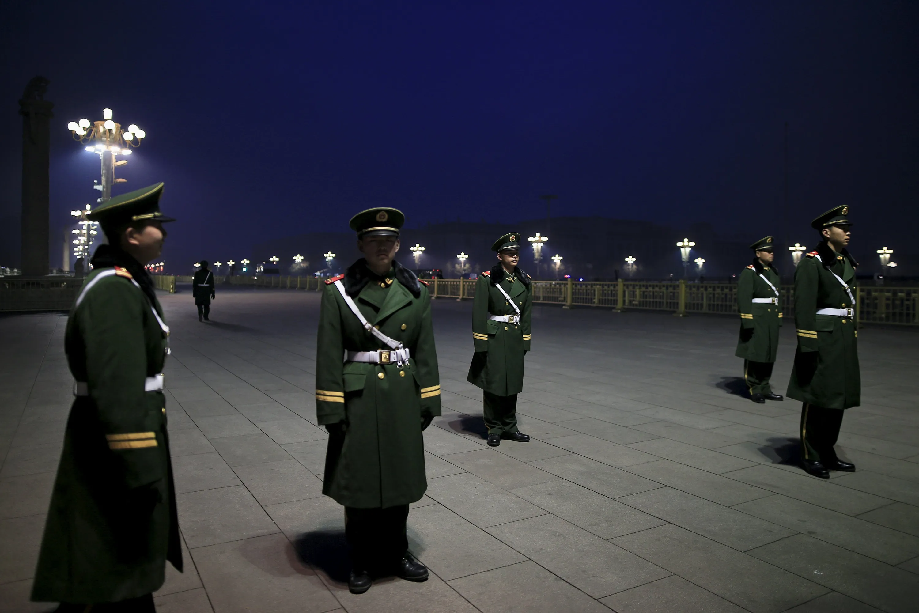 Paramilitary policemen stand guard as the area near the Great Hall of the People is prepared for upcoming annual sessions of the National People's Congress (NPC) and Chinese People's Political Consultative Conference (CPPCC) in Beijing March 3, 2016. (Photo by Aly Song/Reuters)