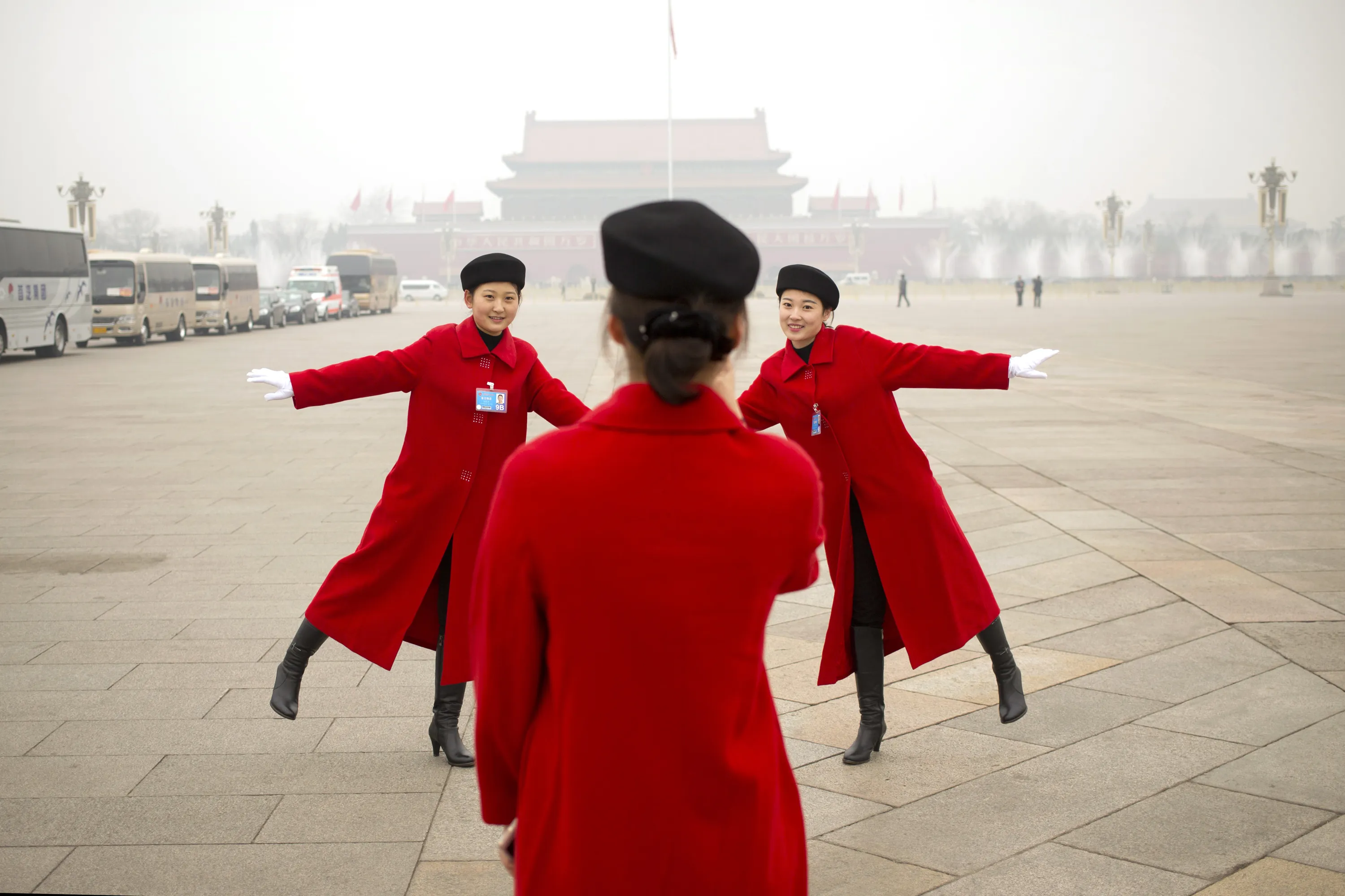 Hostesses, who facilitated the arrival of delegates on buses, pose for photos on Tiananmen Square near the Great Hall of the People in Beijing during a meeting ahead of Saturday's opening session of China's National People's Congress (NPC), Friday, March 4, 2016. (Photo by Mark Schiefelbein/AP Photo)