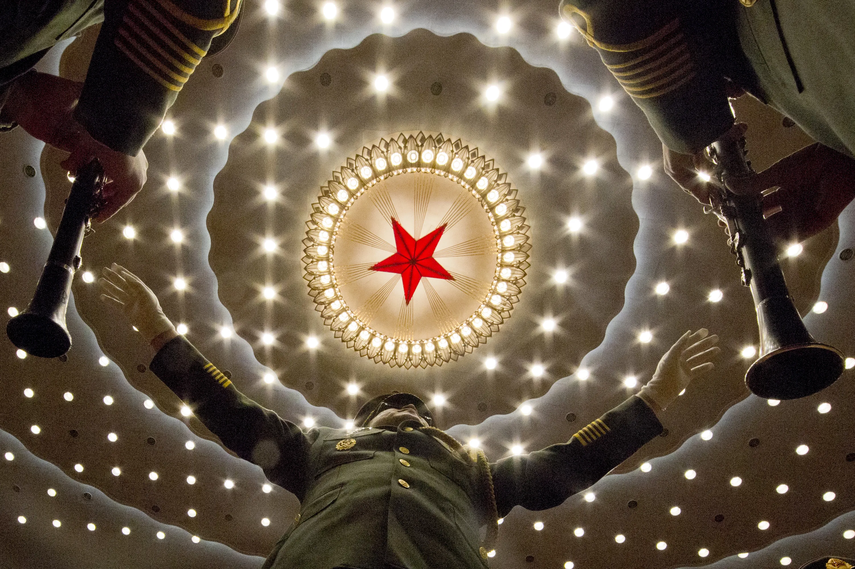 A Chinese military band conductor leads the band at the opening session of the annual National People's Congress in Beijing's Great Hall of the People, Saturday, March 5, 2016. (Photo by Ng Han Guan/AP Photo)