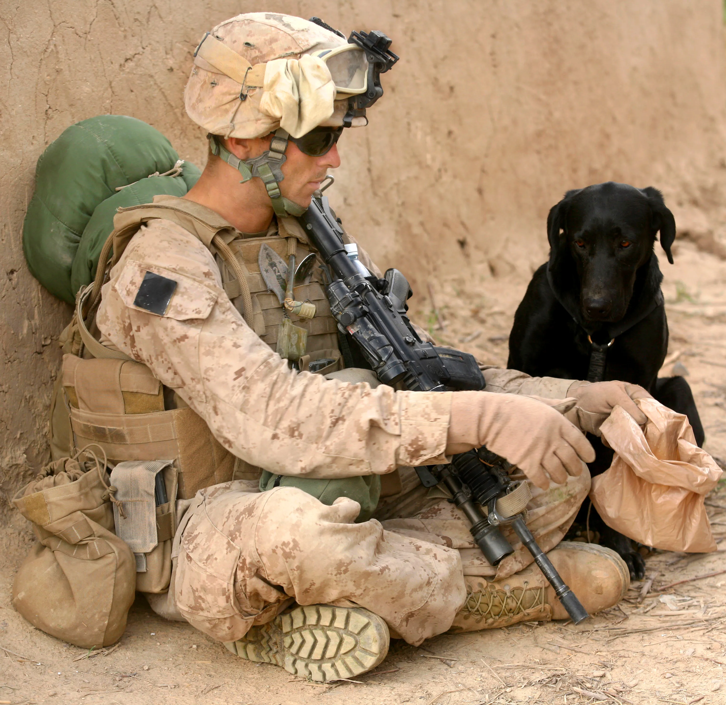 Lance Cpl. Michael Ray Evans, Jr., a dog handler with 3rd Platoon, India Company, 3rd Battalion, 6th Marine Regiment, gives water to his dog, Allie, while on a patrol in Marjah, Helmand province, Afghanistan, February 21, 2010. (Photo by Lance Cpl. Tommy Bellegarde/U.S. Marine Corps)