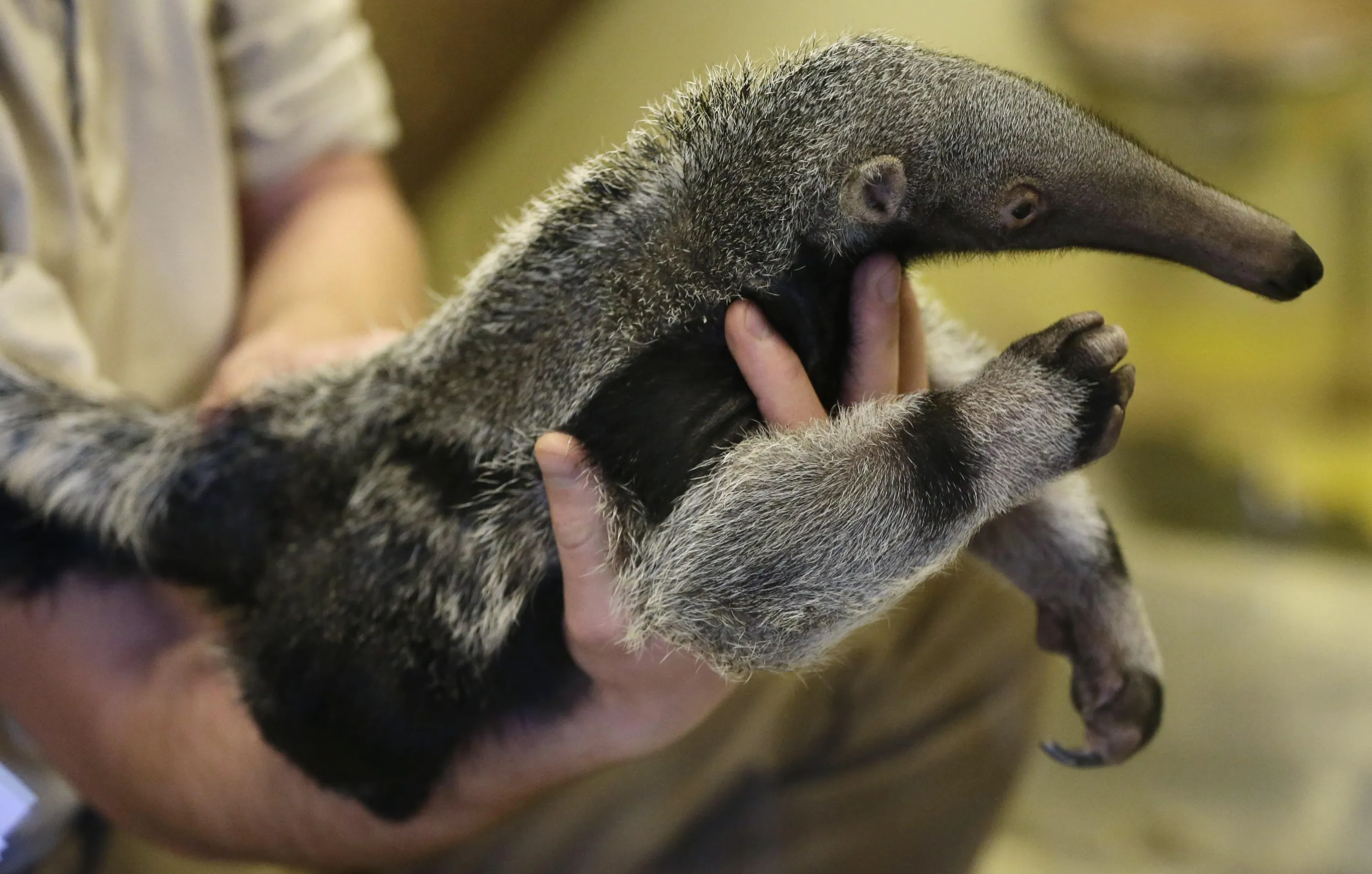 A baby of giant anteater is presented at its enclosure at the zoo in Prague, Czech Republic, Wednesday, March 2, 2016. The baby was born on Jan. 20, 2016. For Prague Zoo it is the first baby anteater born in its breeding history. (Photo by Petr David Josek/AP Photo)