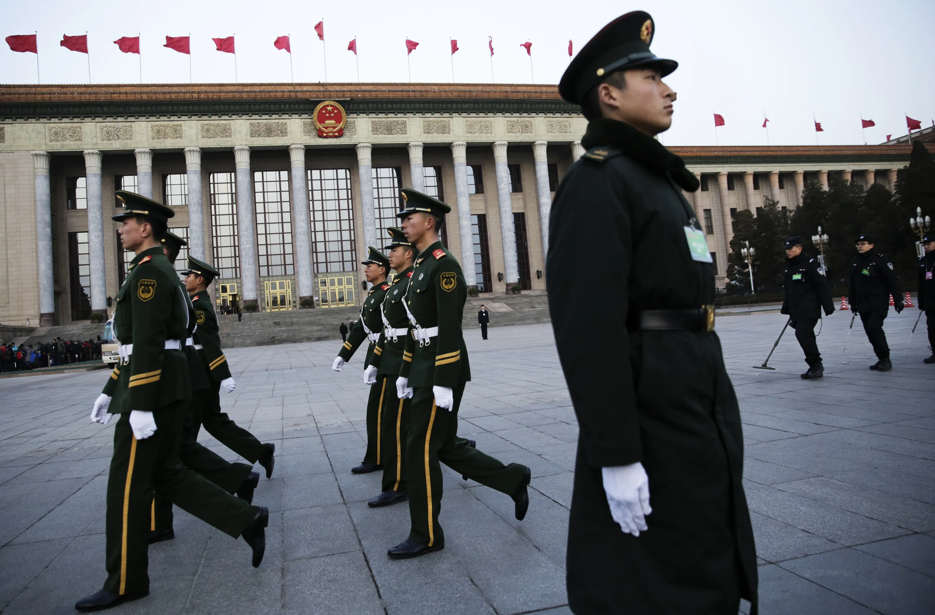 In this Saturday, March 5, 2016 photo, Chinese security personnel march past the Great Hall of the People where the opening session of the National People's Congress (NPC) is held in Beijing. (Photo by Mark Schiefelbein/AP Photo)