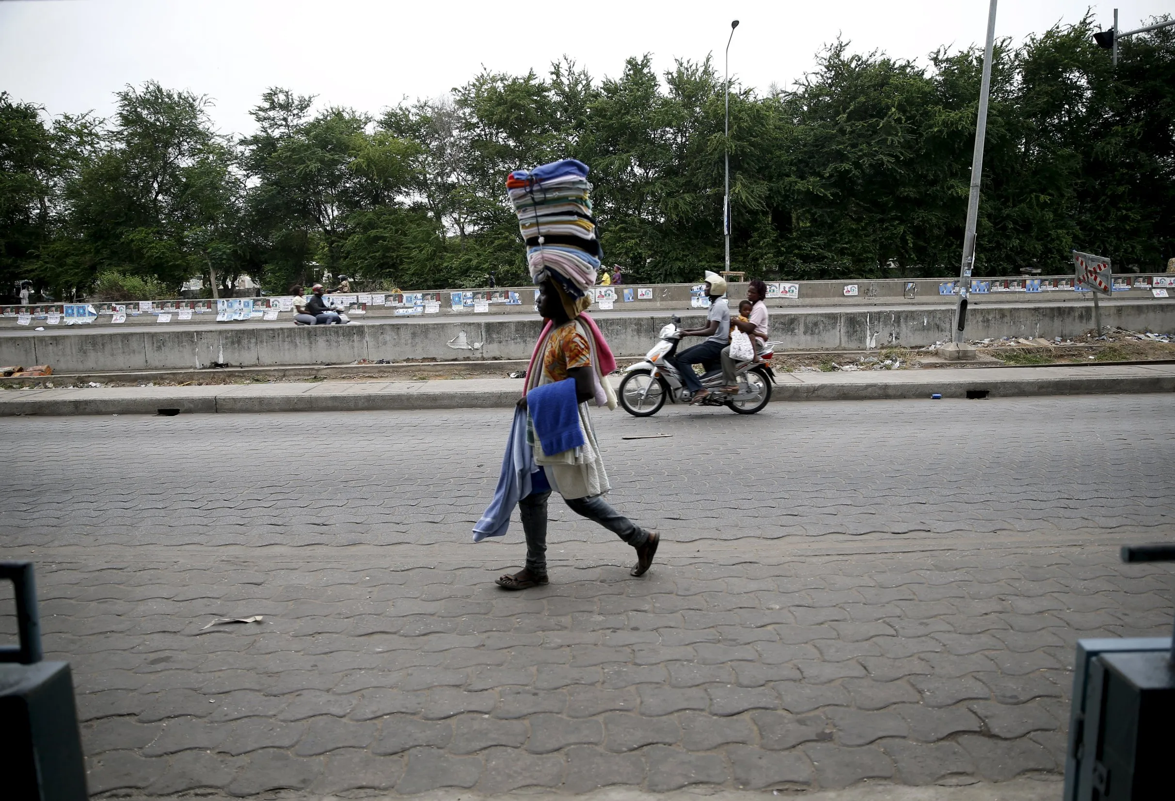 A man carries cloths on his head as he walks along a road in Cotonou, March 5, 2016. (Photo by Akintunde Akinleye/Reuters)