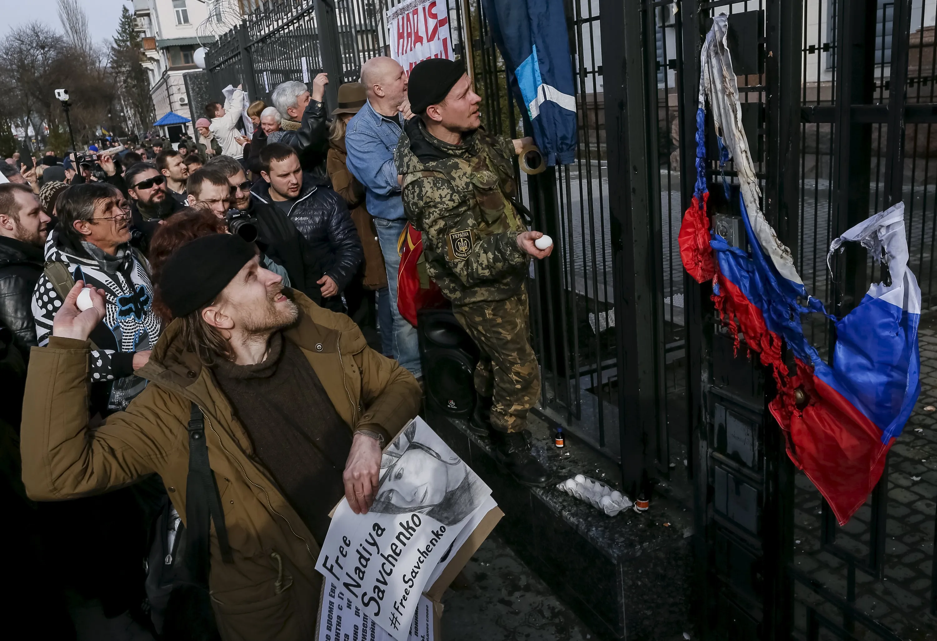 Protesters throw eggs towards a building of the Russian embassy during a rally demanding the liberation of Ukrainian army pilot Nadezhda Savchenko by Russia, in Kiev, Ukraine, March 6, 2016. (Photo by Gleb Garanich/Reuters)