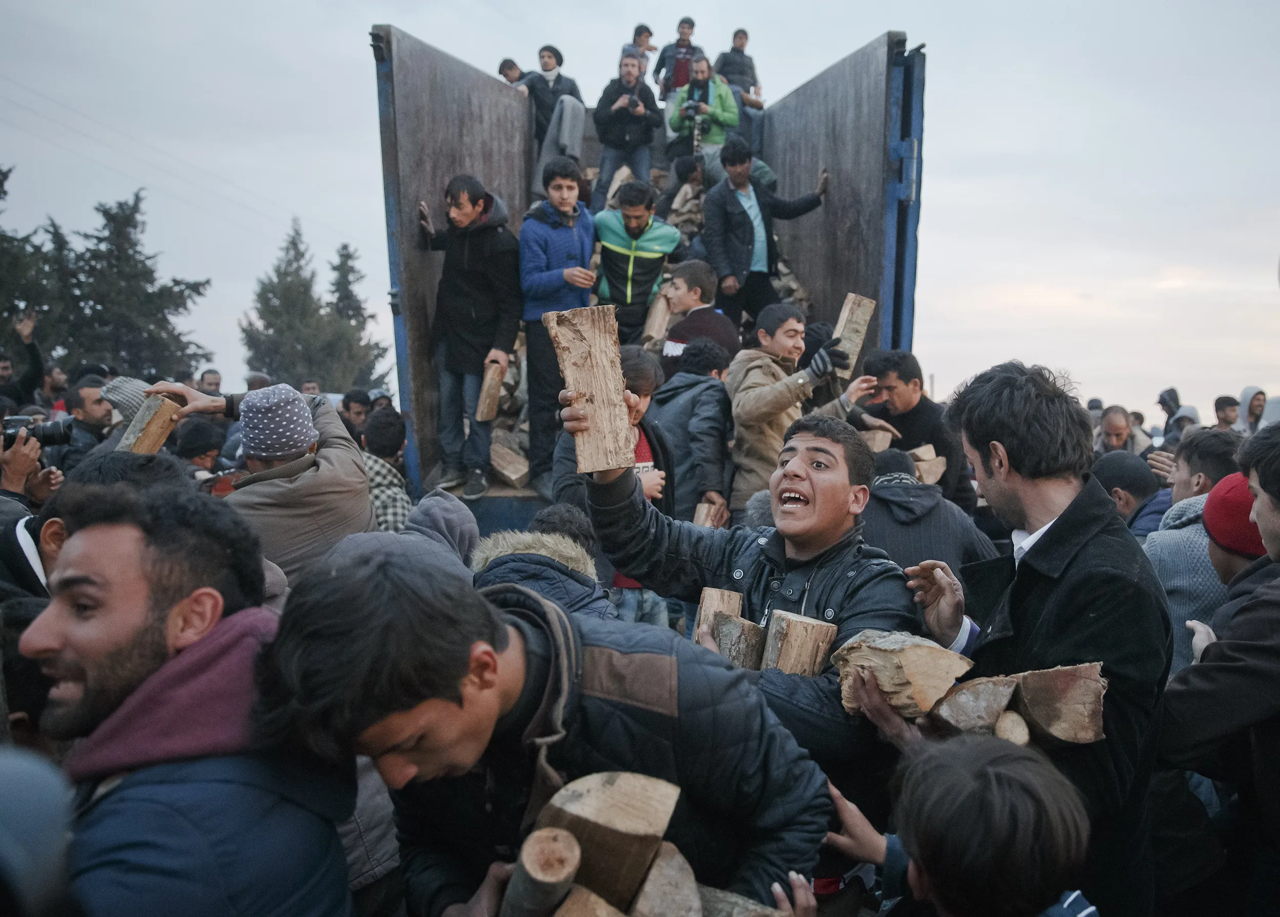 Migrants mob a truck bringing donated firewood at the northern Greek border station of Idomeni, Sunday, March 6, 2016. Greek police officials say Macedonian authorities have imposed further restrictions on refugees trying to cross the border, saying only those from cities they consider to be at war can enter as up to 14,000 people are trapped in Idomeni, while another 6,000-7,000 are being housed in refugee camps around the region. (Photo by Vadim Ghirda/AP Photo)