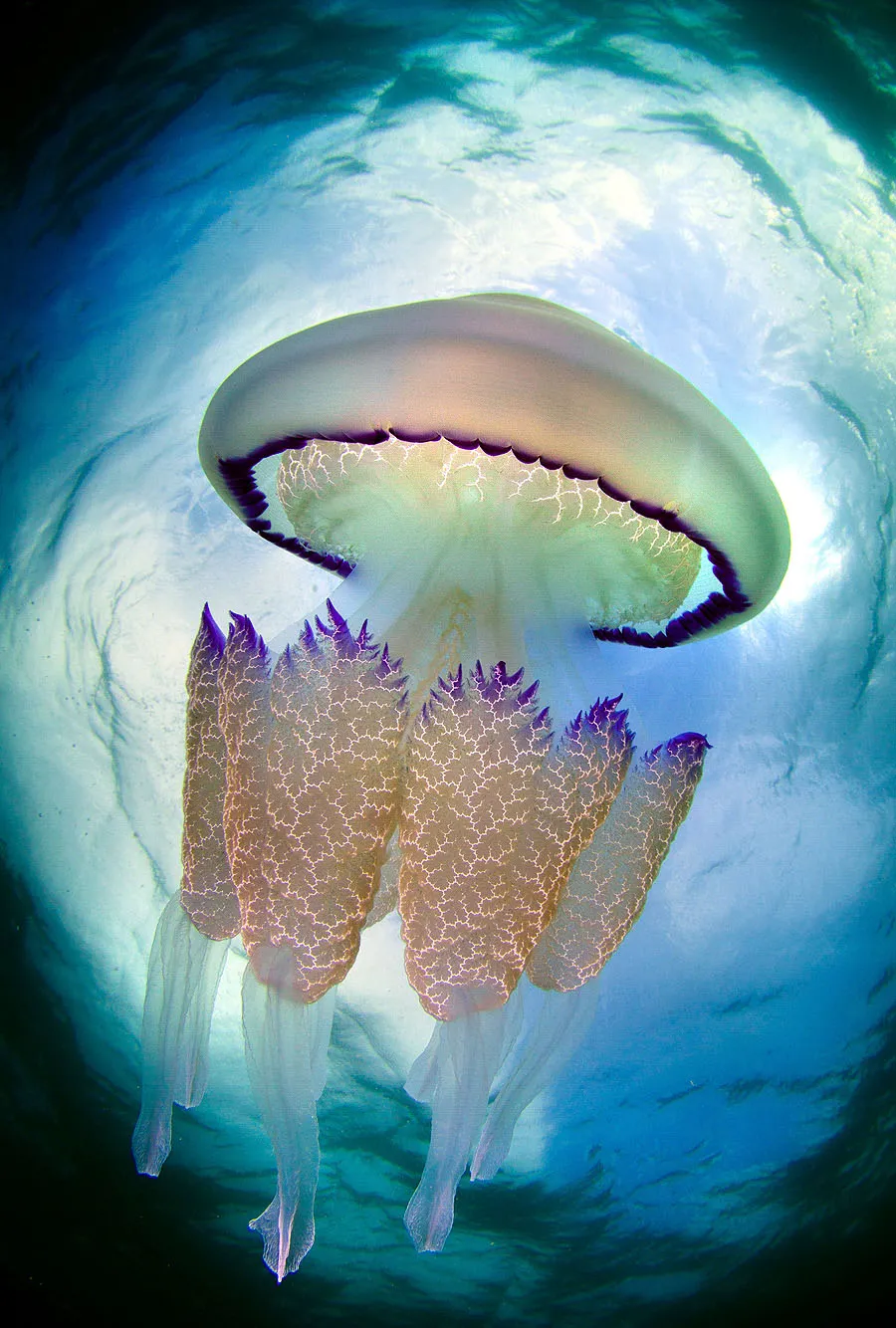 The incredible detail in each photo is thanks to Jordi Benitez Castells, years of experience taking photos while diving. Jordi, 40, from El Vendrell, Spain, was in Catalunya when he took the photos and managed to get the snaps at about three metres below the surface in most cases. While he works full-time in a bank, Jordi dons his wetsuit out of hours to go diving and uses a Canon 7D to get his shots. Here: One of the beautiful jellyfish. (Photo by Jordi Benitez/Caters News)