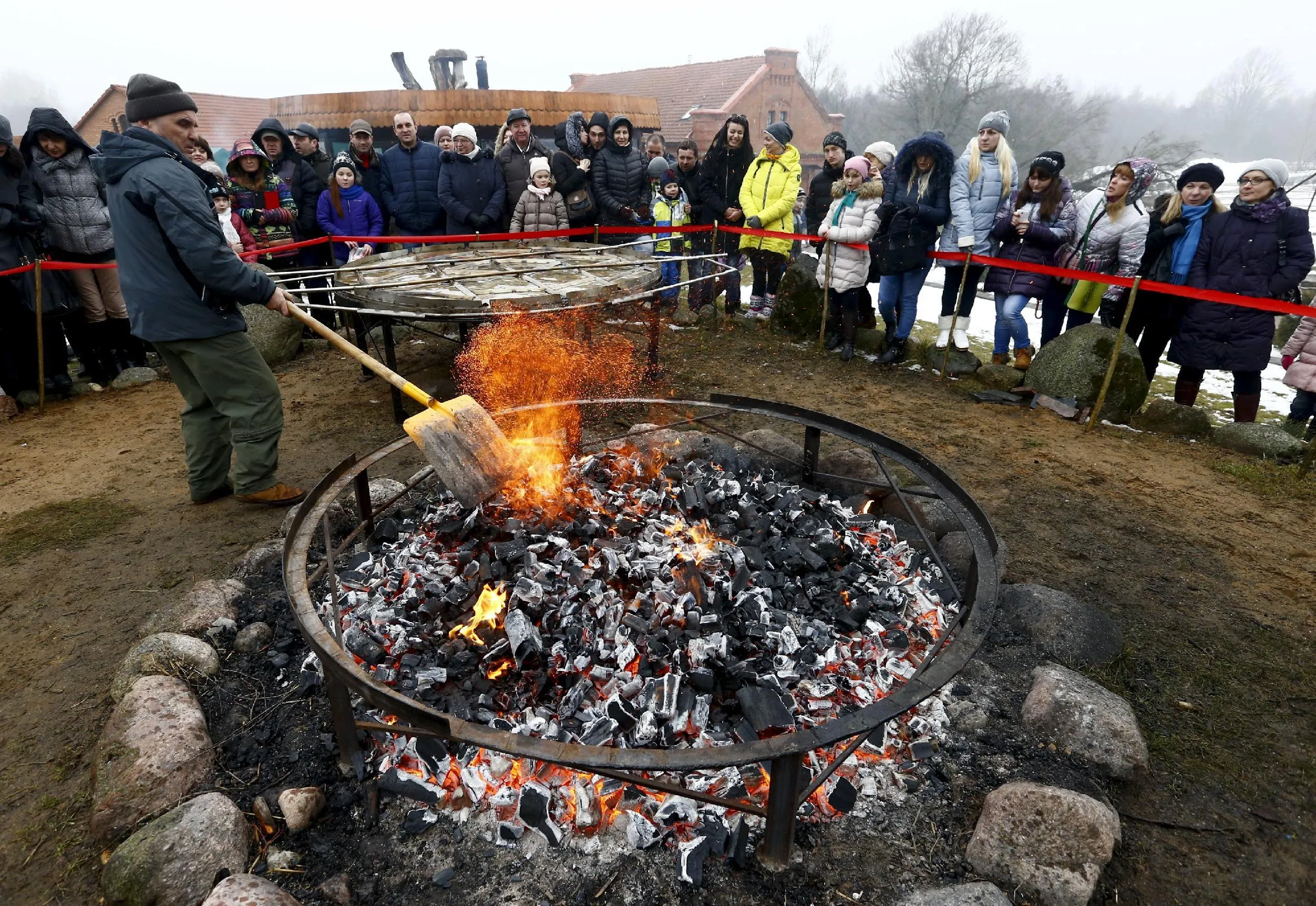 A man prepares the fire for frying dranik, a potato pancake that is the national dish of Belarus, in the Sula History Park near the village of Sula, Belarus March 7, 2016. (Photo by Vasily Fedosenko/Reuters)