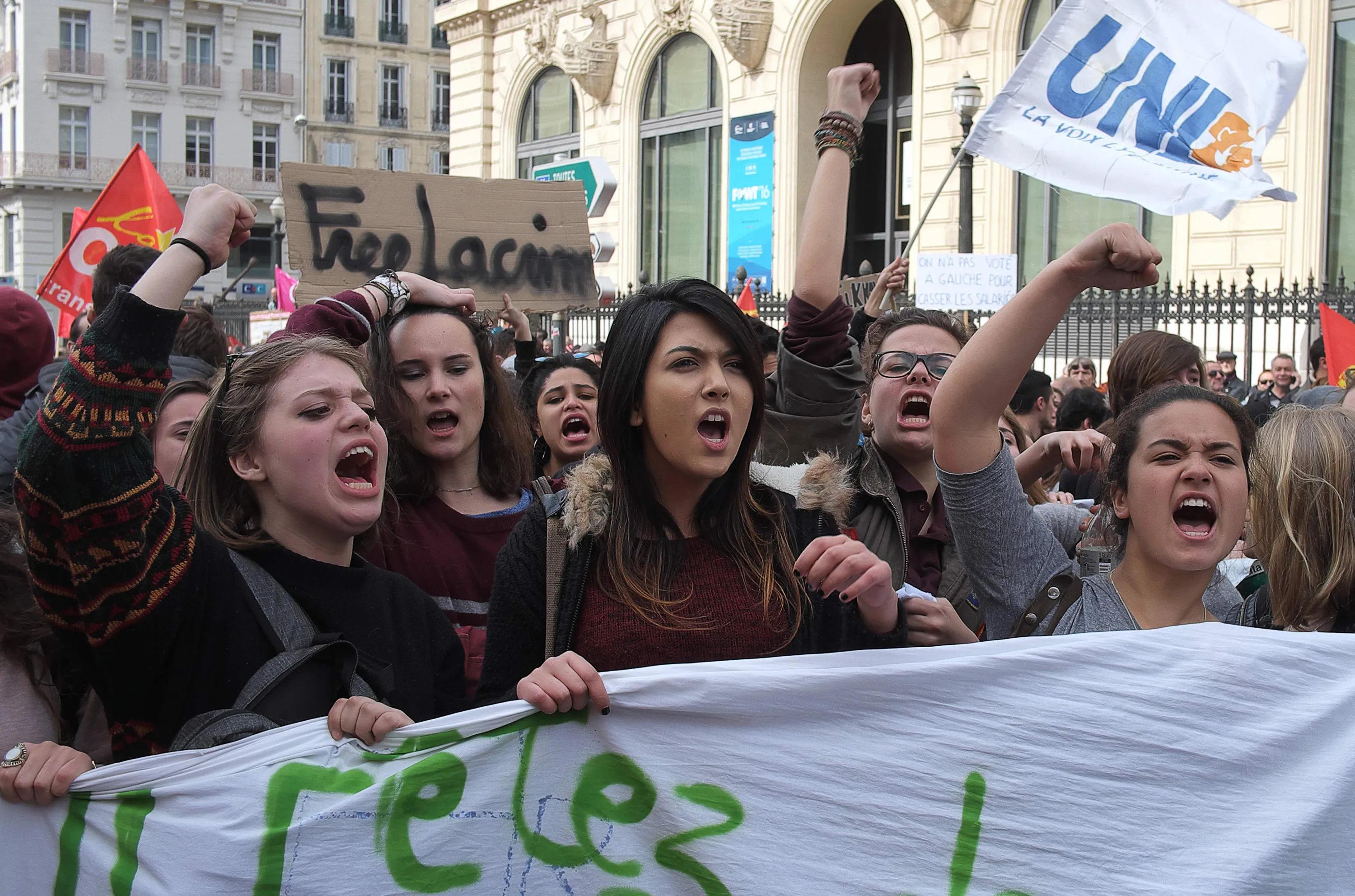 Marseille high scholl pupils called by youth organizations demonstrate on March 9, 2016, in Marseille, to protest the government's planned deeply unpopular labour reforms. France faced a wave of protests today against deeply unpopular labour reforms that have divided an already-fractured Socialist government and raised hackles in a country accustomed to iron-clad job security. (Photo by Boris Horvat/AFP Photo)