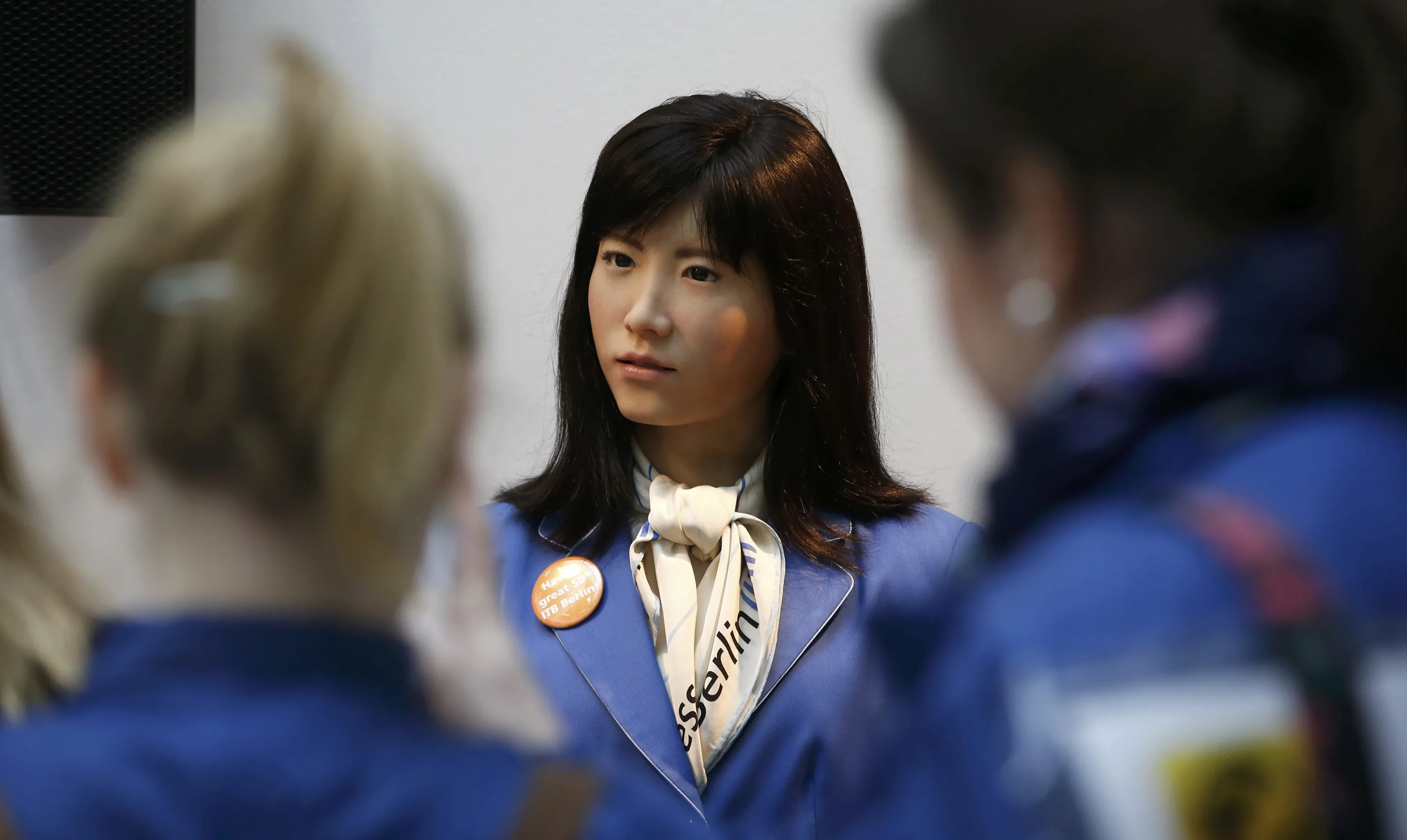 Visitors listen to communication android “Chihira Kanae” (C) at an information counter at the International Tourism Trade Fair (ITB) in Berlin, Germany, March 9, 2016. “Chihira Kanae”, which was created by Toshiba, has her own information counter where she welcomes visitors through two way communication, provides information on the trade fair and answers any questions visitors may have in English, German, Japanese and Chinese. (Photo by Fabrizio Bensch/Reuters)