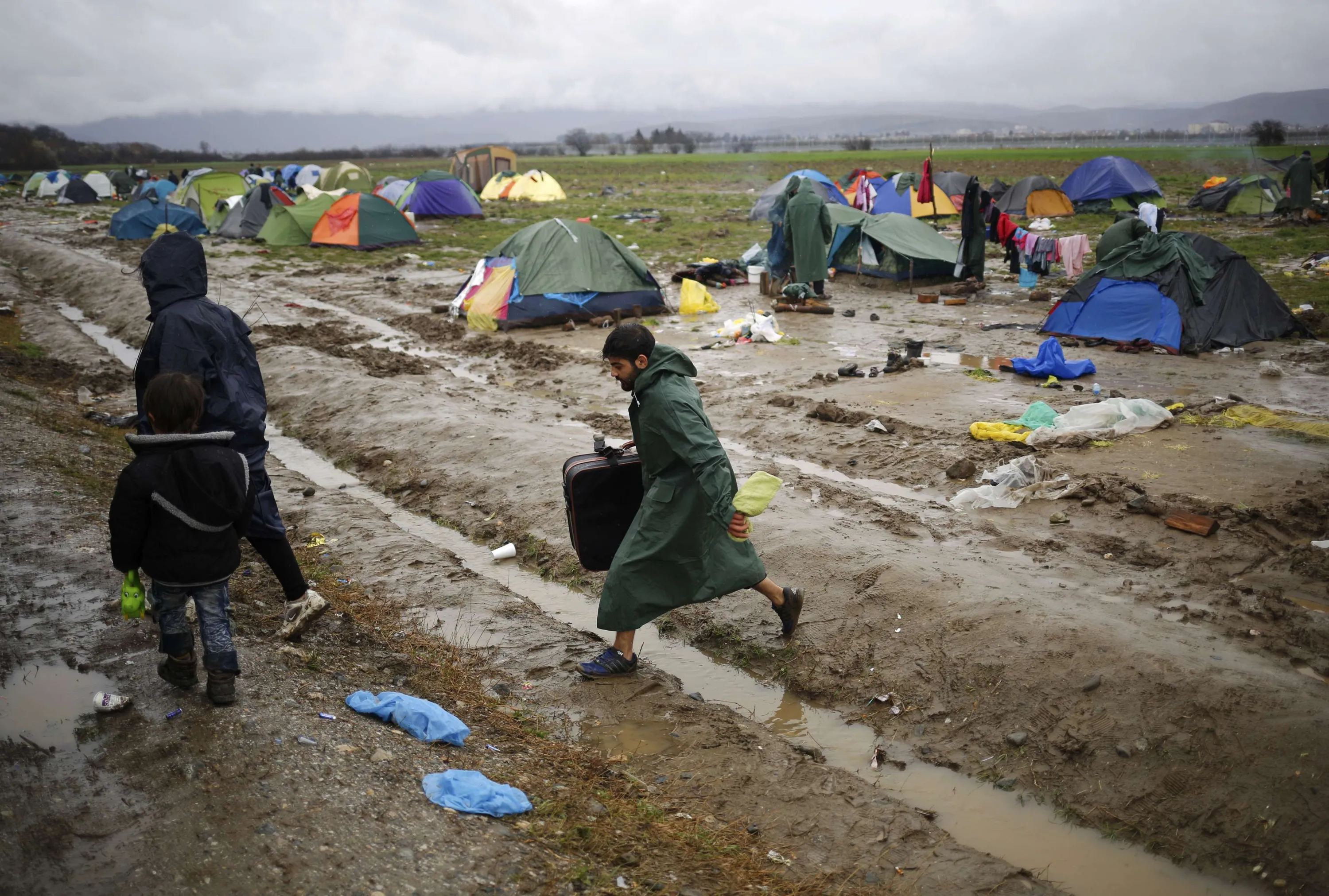 Migrants walk in a mud at a makeshift camp on the Greek-Macedonian border, near the village of Idomeni, Greece March 10, 2016. (Photo by Stoyan Nenov/Reuters)