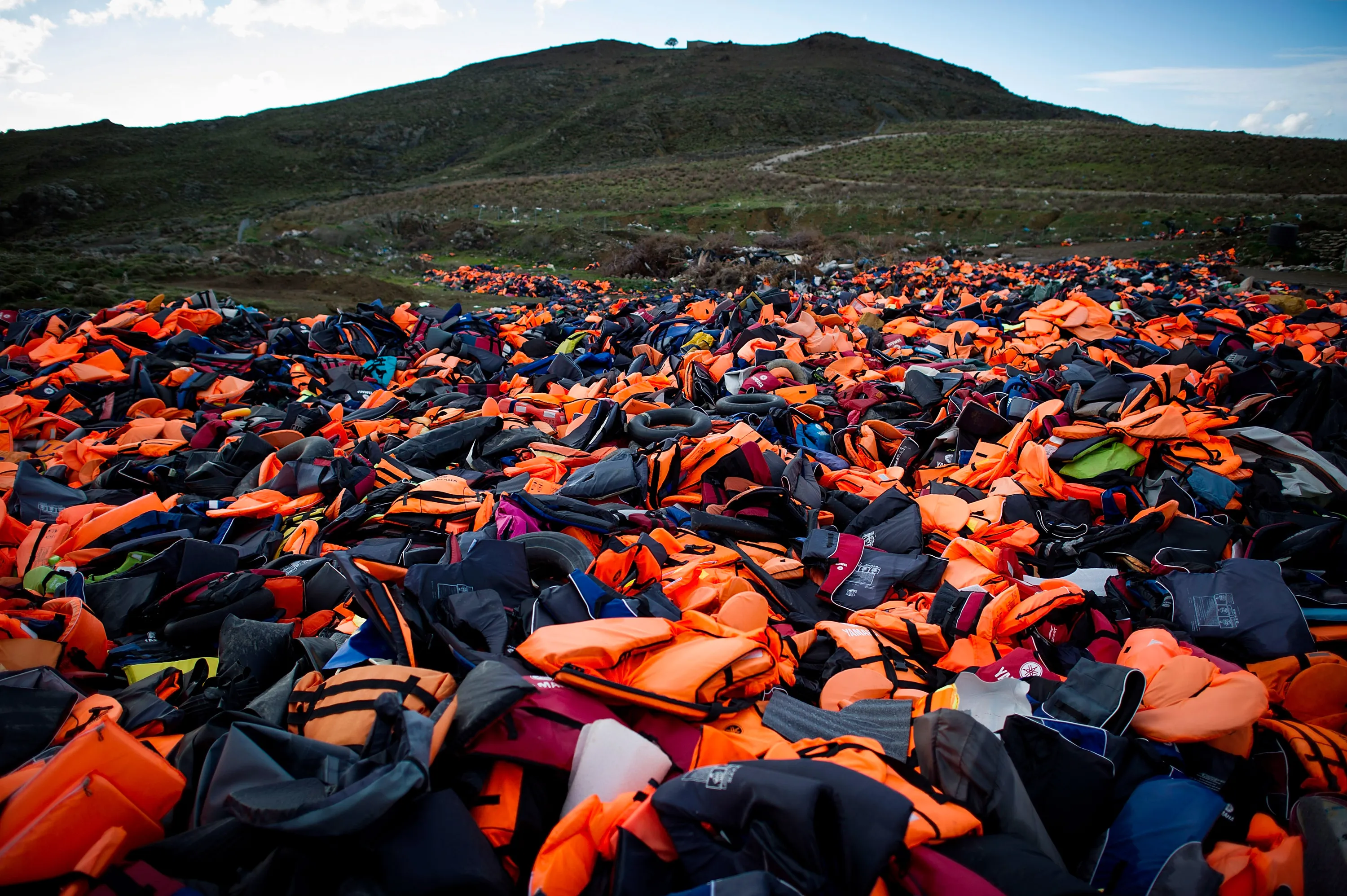 Hundreds of used life vests lie on a makeshift rubbish dump hidden in the hills above the town on March 10, 2016 in Mithymna, Greece. (Photo by Alexander Koerner/Getty Images)