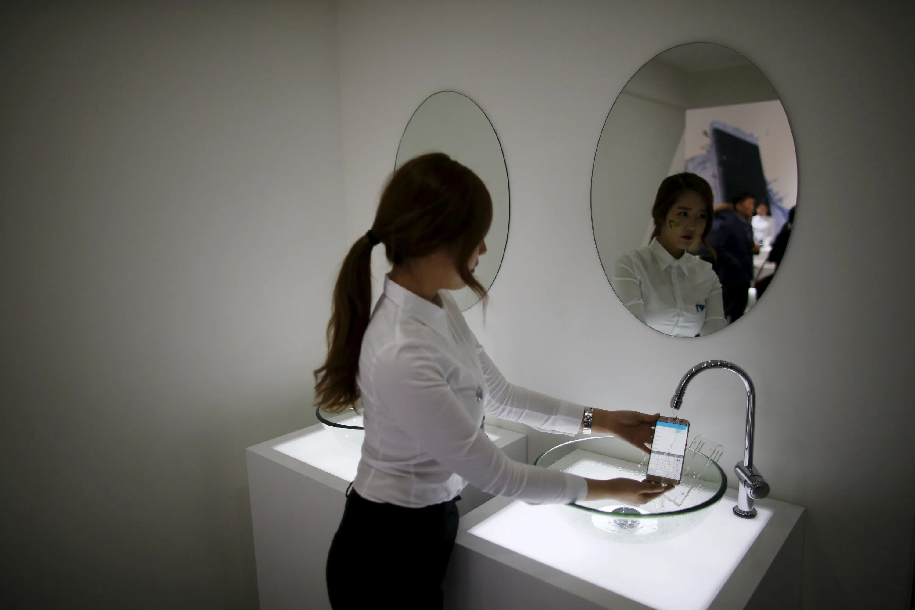 A model demonstrates waterproof function of Samsung Electronics' new smartphone Galaxy S7 Edge during its launching ceremony in Seoul, South Korea, March 10, 2016. (Photo by Kim Hong-Ji/Reuters)