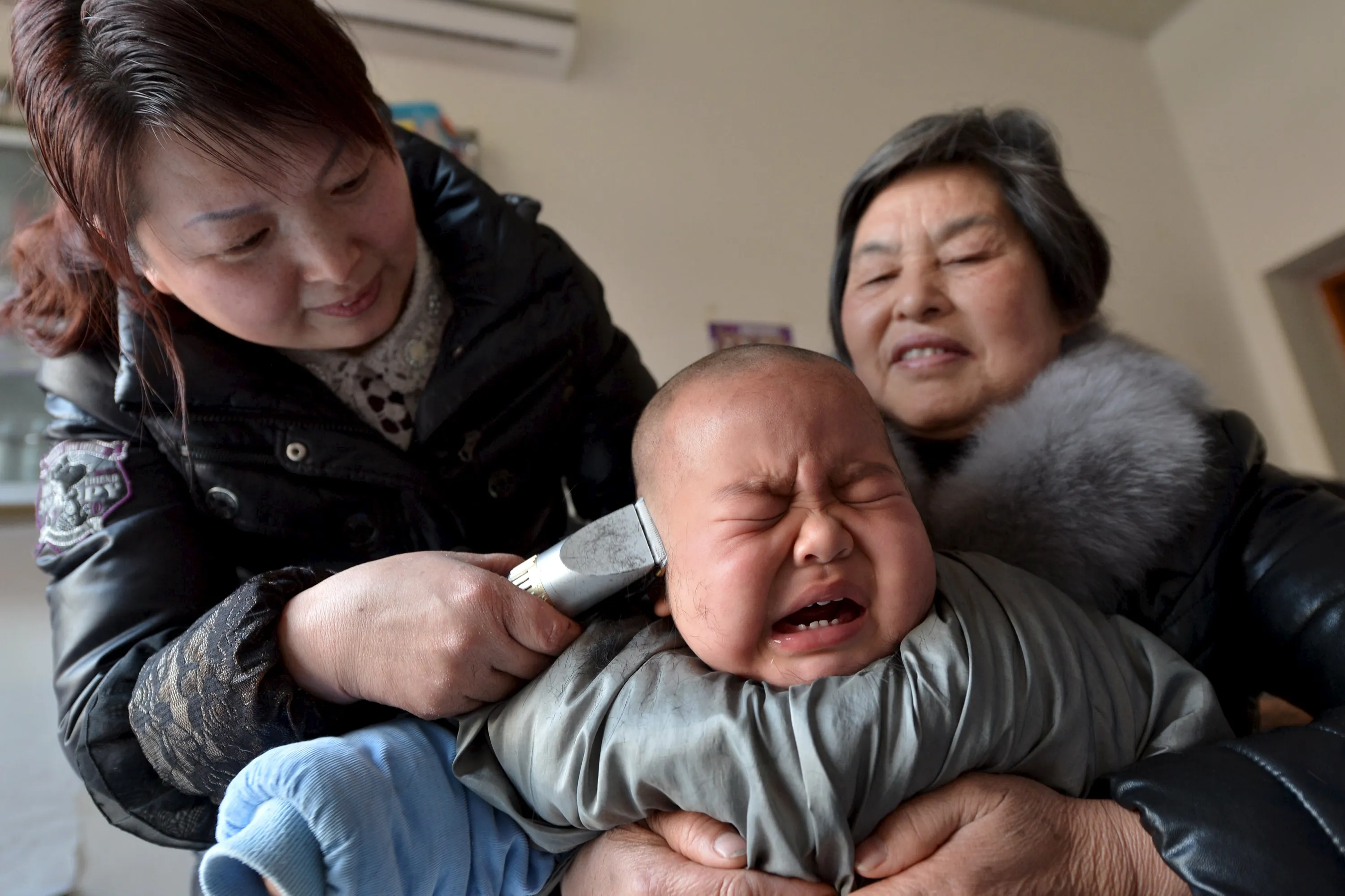 A child cries during a haircut in a barbershop during the Longtaitou (which means the dragon raises its head) Festival, on the second day of the second month of Chinese Lunar calendar, in Baokang County, Hubei Province, China, March 10, 2016. It is believed that having a haircut on this day is likely to bring good luck. (Photo by Reuters/China Daily)