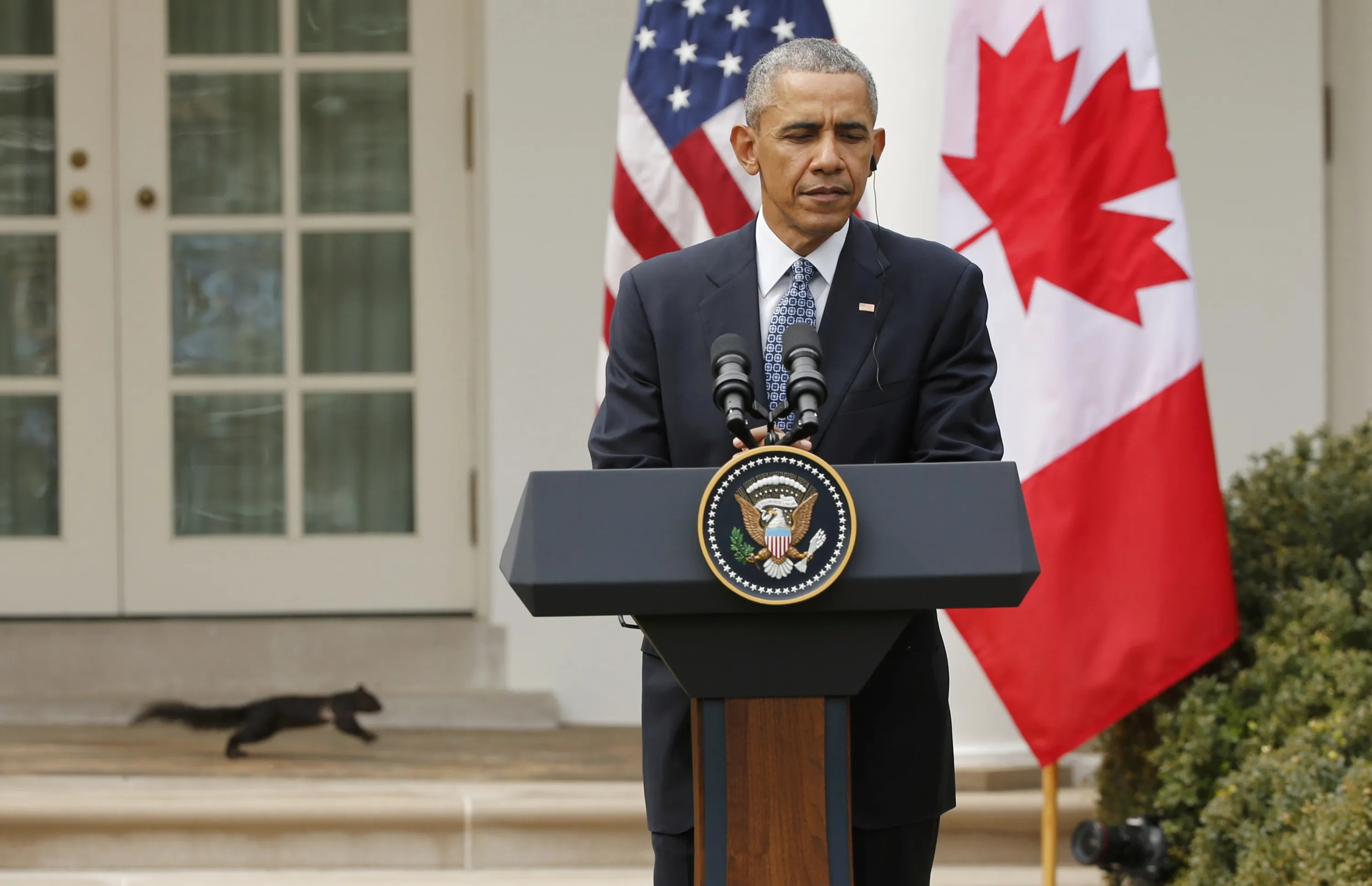 A wild squirrel runs down the White House colonnade behind U.S. President Barack Obama as he pauses during a joint news conference with Canadian Prime Minister Justin Trudeau in the Rose Garden at the White House in Washington March 10, 2016. (Photo by Jonathan Ernst/Reuters)