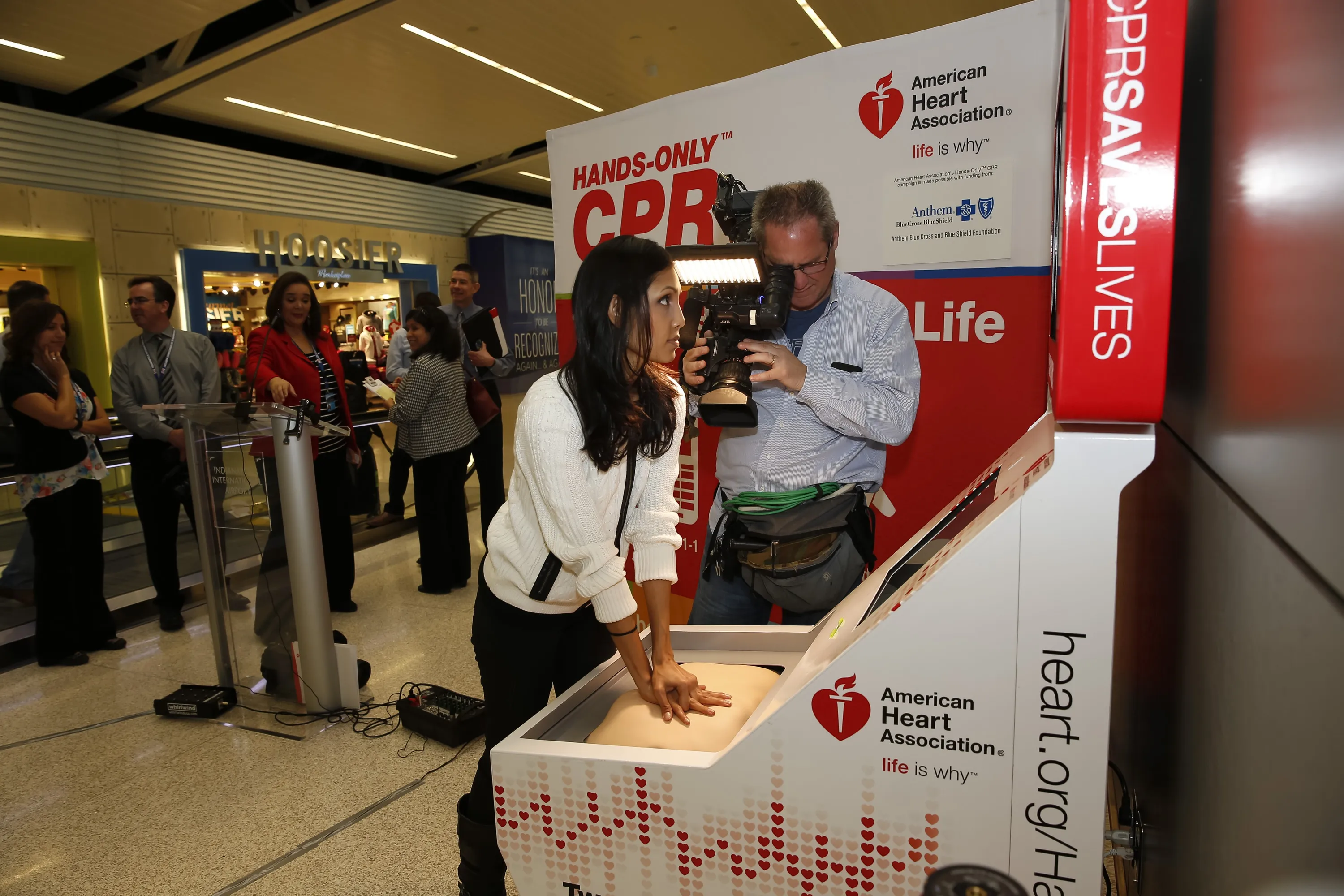 Reporter Melissa Mahadeo learns how to perform Hands-On CPR after the unveiling of the American Heart Association and Anthem Blue Cross and Blue Shield in Indiana Hands-Only CPR Training Kiosk at Indianapolis International Airport on March 10, 2016 in Indianapolis, Indiana. (Photo by Michael Hickey/Getty Images for American Heart Association)